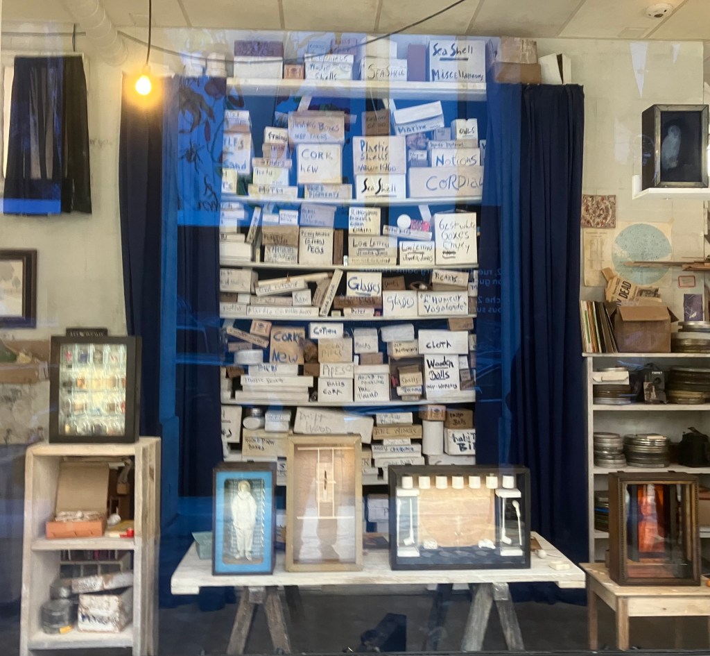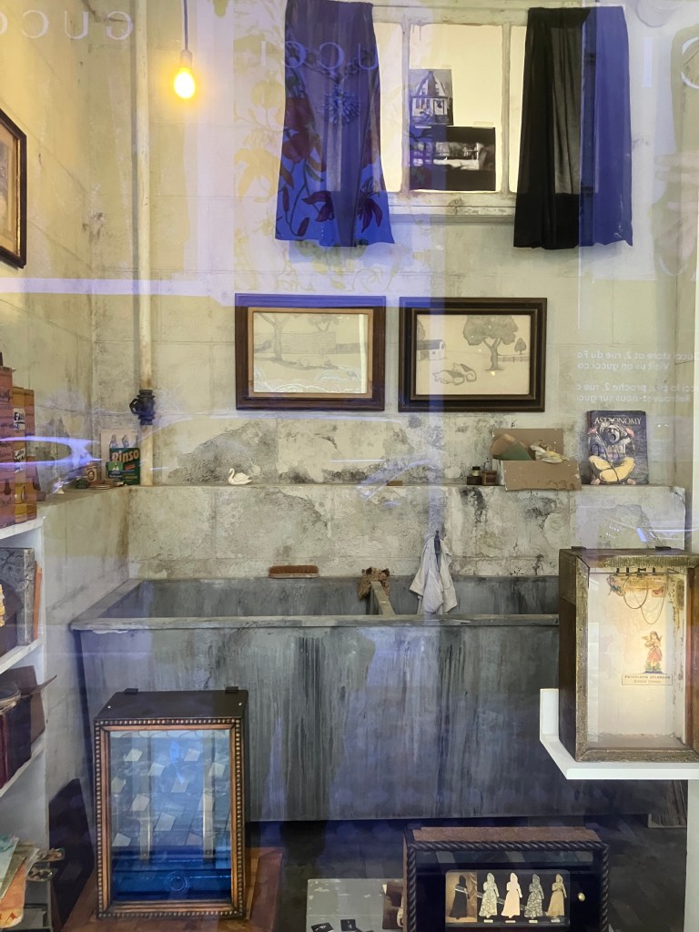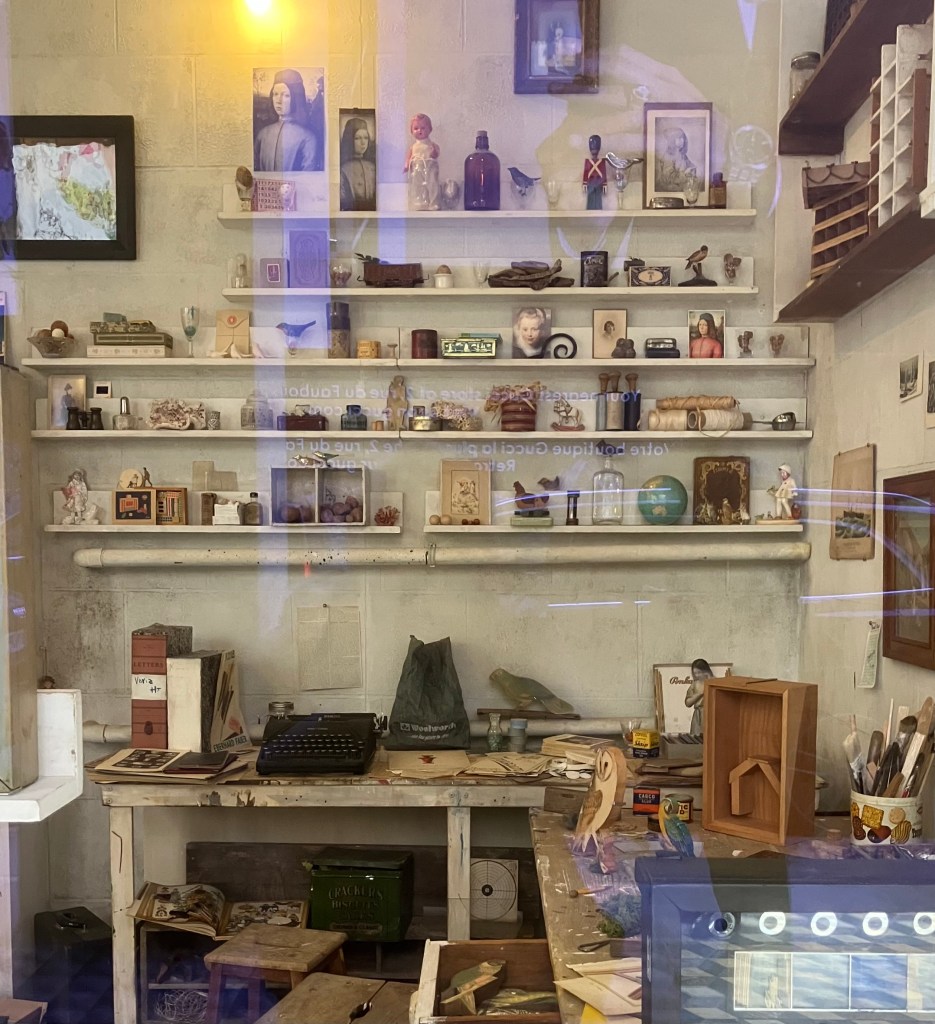 oui, oui, le célèbre cinéaste,Wes ANDERSON , recrée pour nous l’atelier de Joseph Cornell , que nous ne pouvons regarder que par les 4 vitrines de la galerie sous les arcades, près de la place Vendôme !