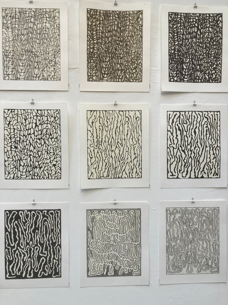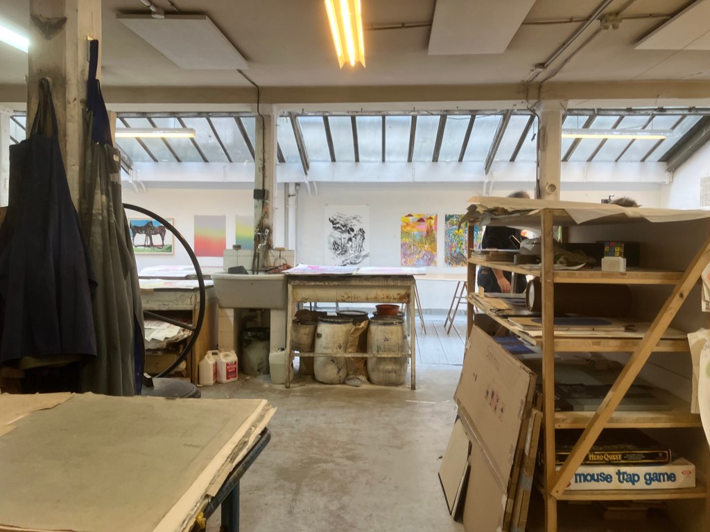 on y célèbre les 40 ans de l’atelier ,on entre dans la première petite pièce qui présente quelques lithos et estampes et des livres d’artistes .