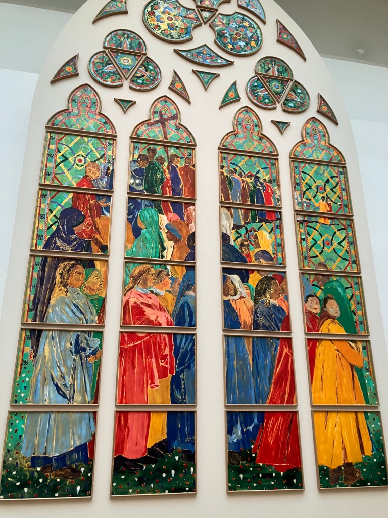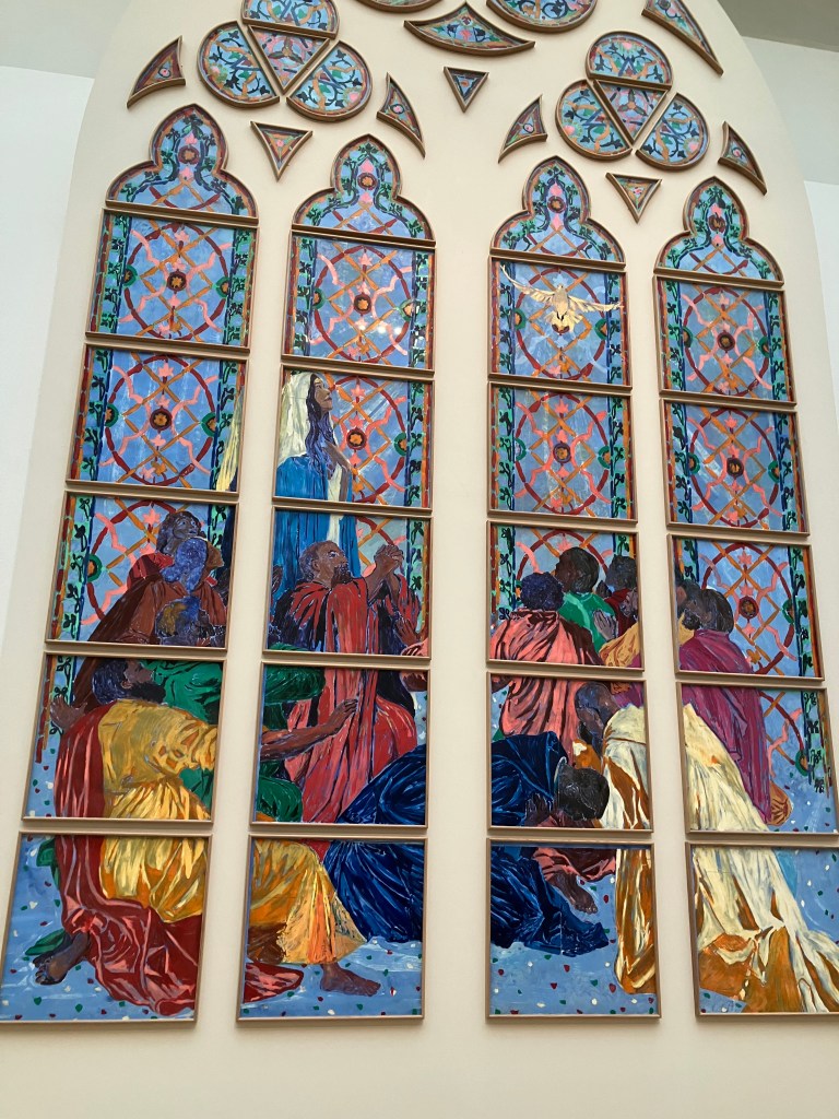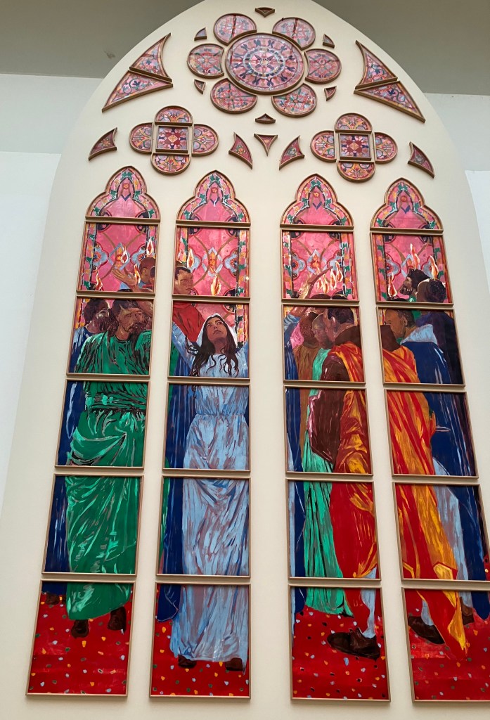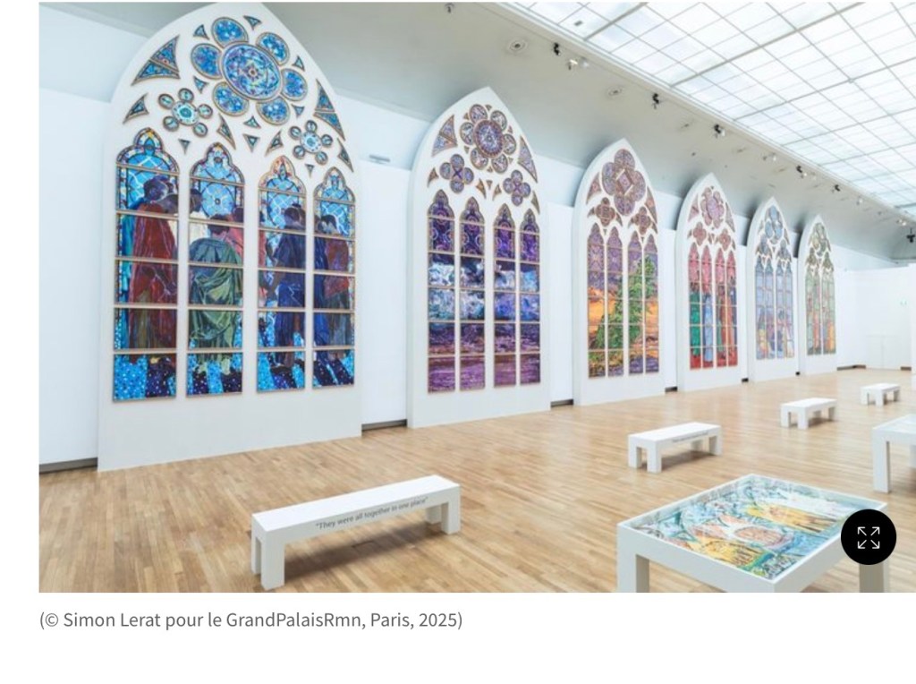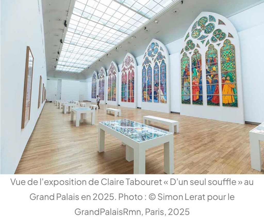 on attend bien sûr des tapisseries et les vitraux de Claire Tabouret . Au grand Palais , pour 15 euros on peut voir ses recherches théologiques sur la Pentecôte , ses recherches de couleurs , de postures , de liens avec les grisailles , rien n’est figé , c’est passionnant .