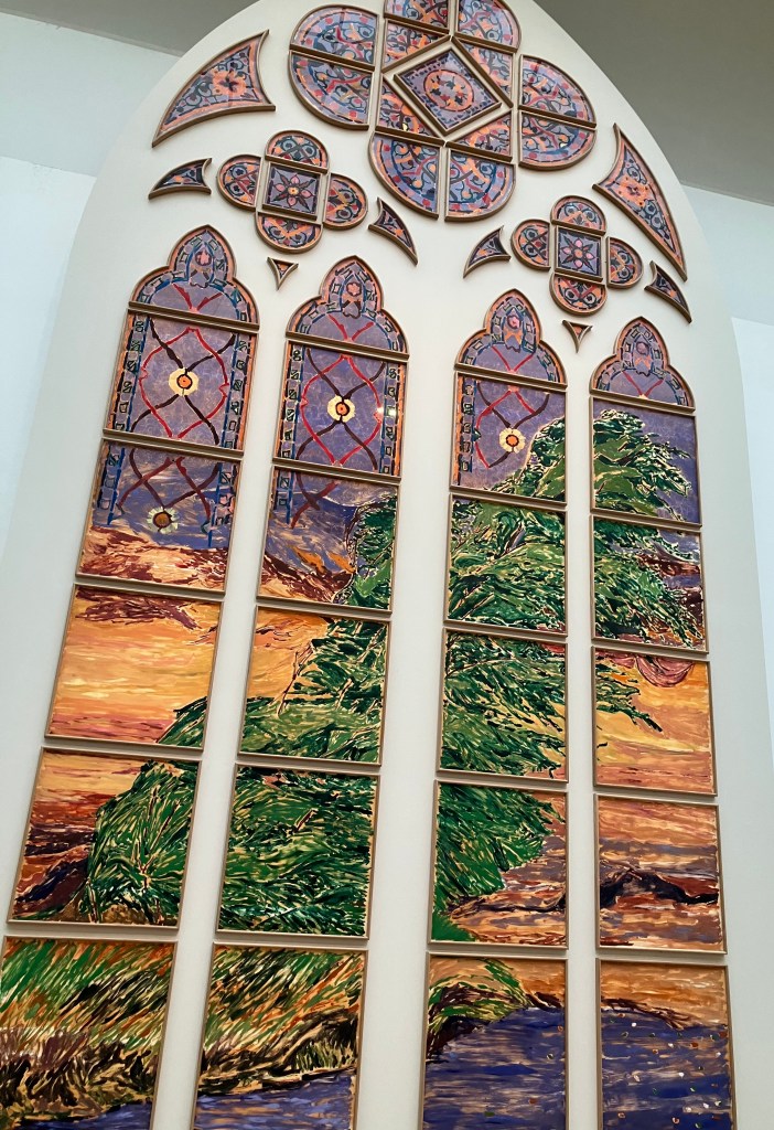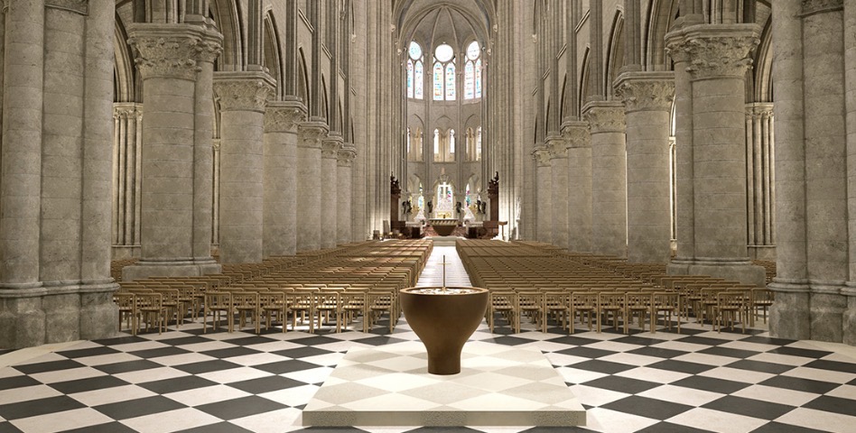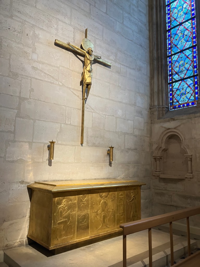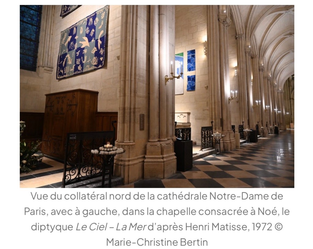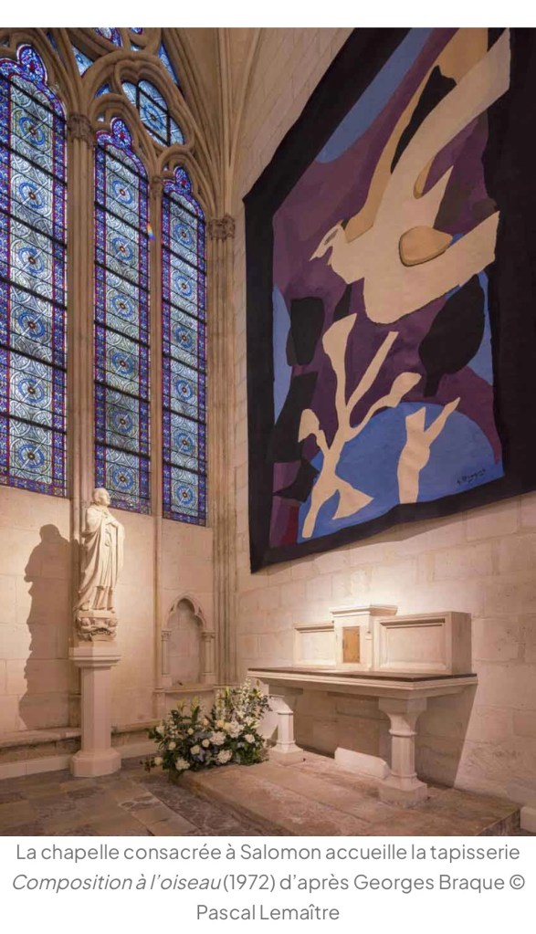 vive la cathédre , l’autel , les tapisseries de Matisse et de Braque , le baptistère , les chaises en chêne clair de Iona Vautrin , , les sculptures , le tableau de Yin Xin , le reliquaire de la couronne d’épines du Christ de Sylvain Dubuisson ! Les Oeuvres de Guillaume Bardet.