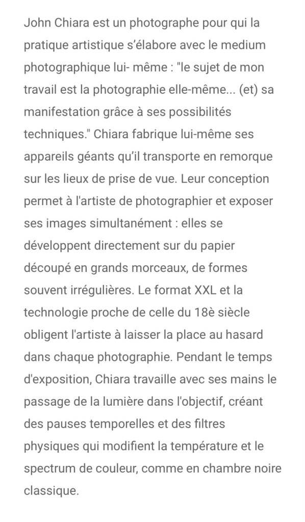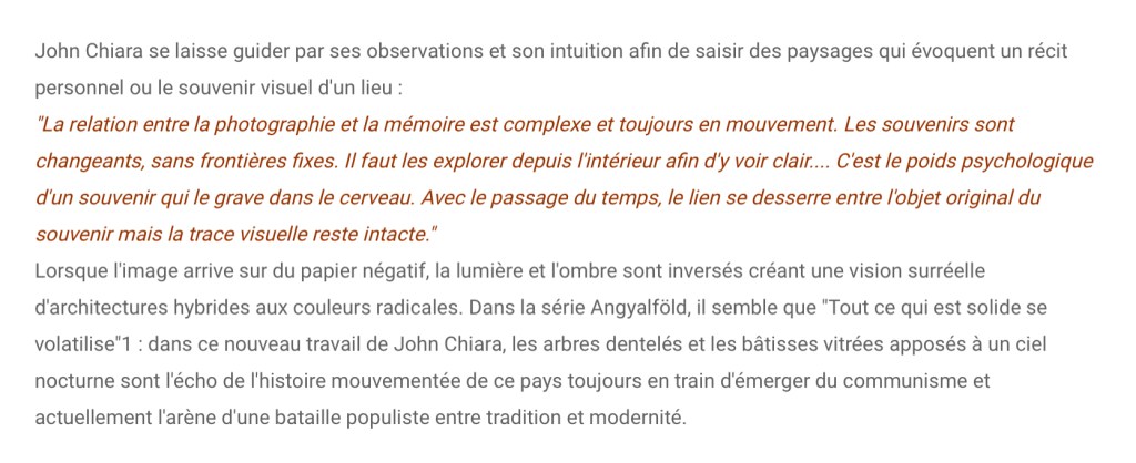 l’artiste ici est John Chiara. Vous avez jusqu’au 2 février pour vous y rendre et apprécier la poussière des anges , du nom d’un quartier de Budapest Angyaföld, où l’artiste était en résidence en 2019 , il a créé d’immenses photos en négatif aux couleurs inversées .
