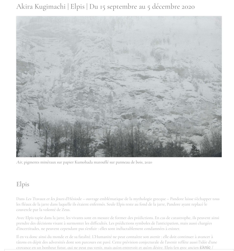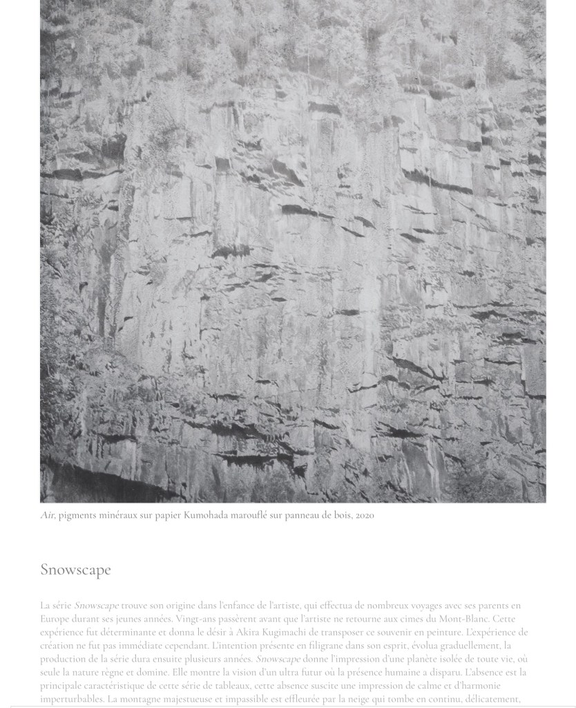 1 – En cette fin d’année , je salue la remarquable galerie Pierre -Yves Caër , 7 rue Notre dame de Nazareth , oui oui , je sais vous regardez régulièrement son site ,donc vous savez que la renversante expo de Akira Kugamachi est terminée , ce travail traditionnel sur papier froissé marouflé , empreint de poudre de nacre , et peu à peu recouvert de lazurite , strate après strate pour former les gris et les noirs de ses paysages de montagne dont on voit bien que ce ne sont ni des photos , ni des dessins à l’encre . Je vous en parle pour rendre hommage à la technique et à la spiritualité de ce grand maître.