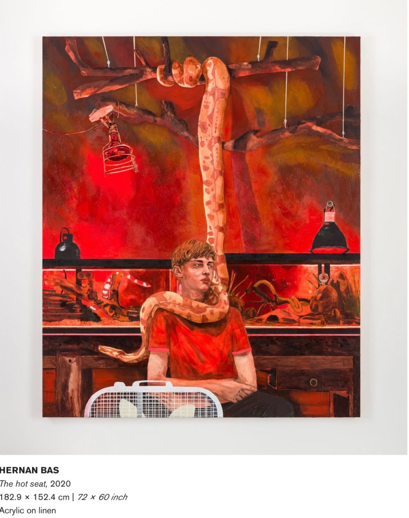 Hernan Bas, creature conforts , peintures faites depuis mars ,à Miami,figuratives, aux jeunes gens soucieux, aux prises avec une réalité trop forte ou onirique .