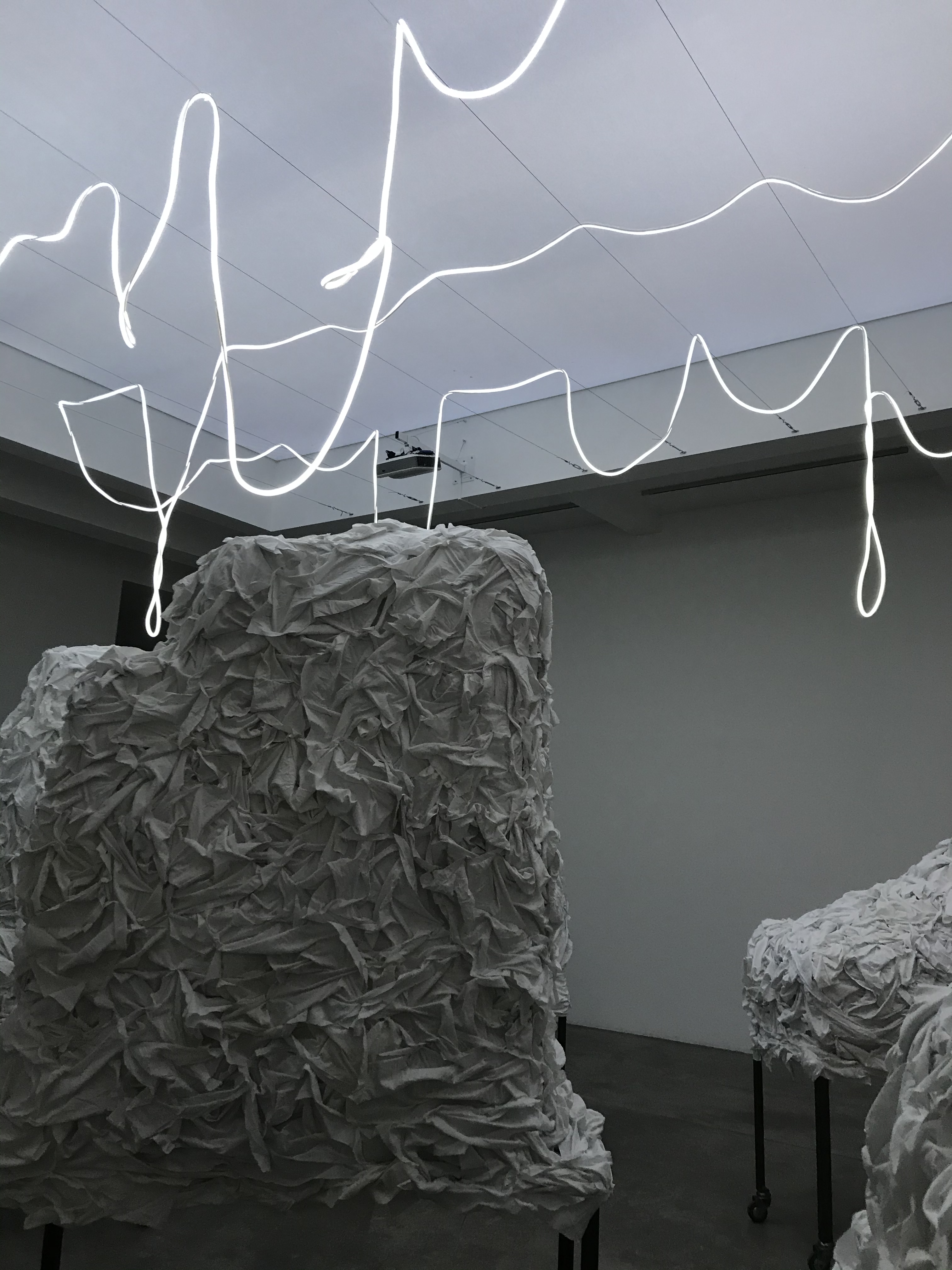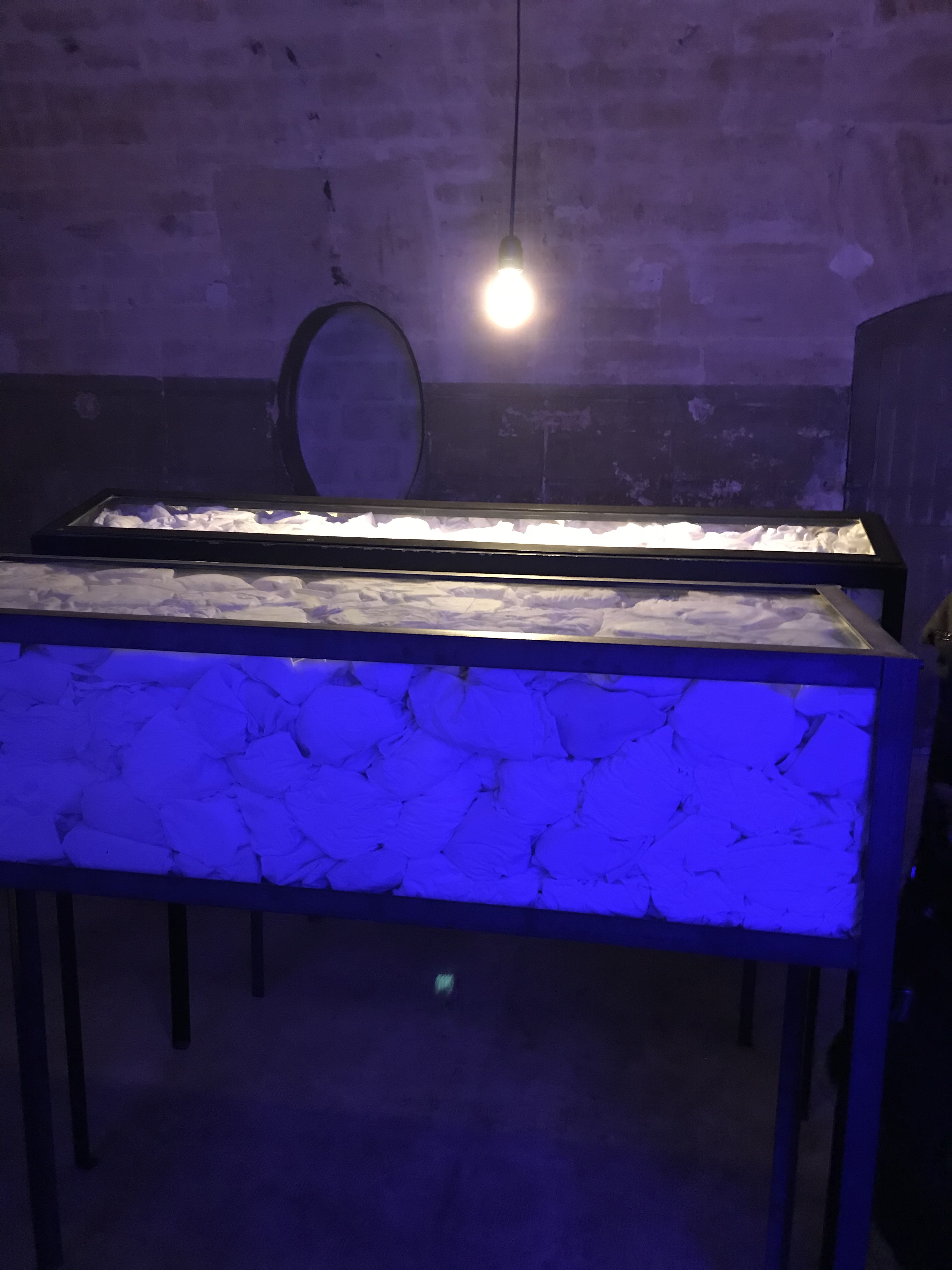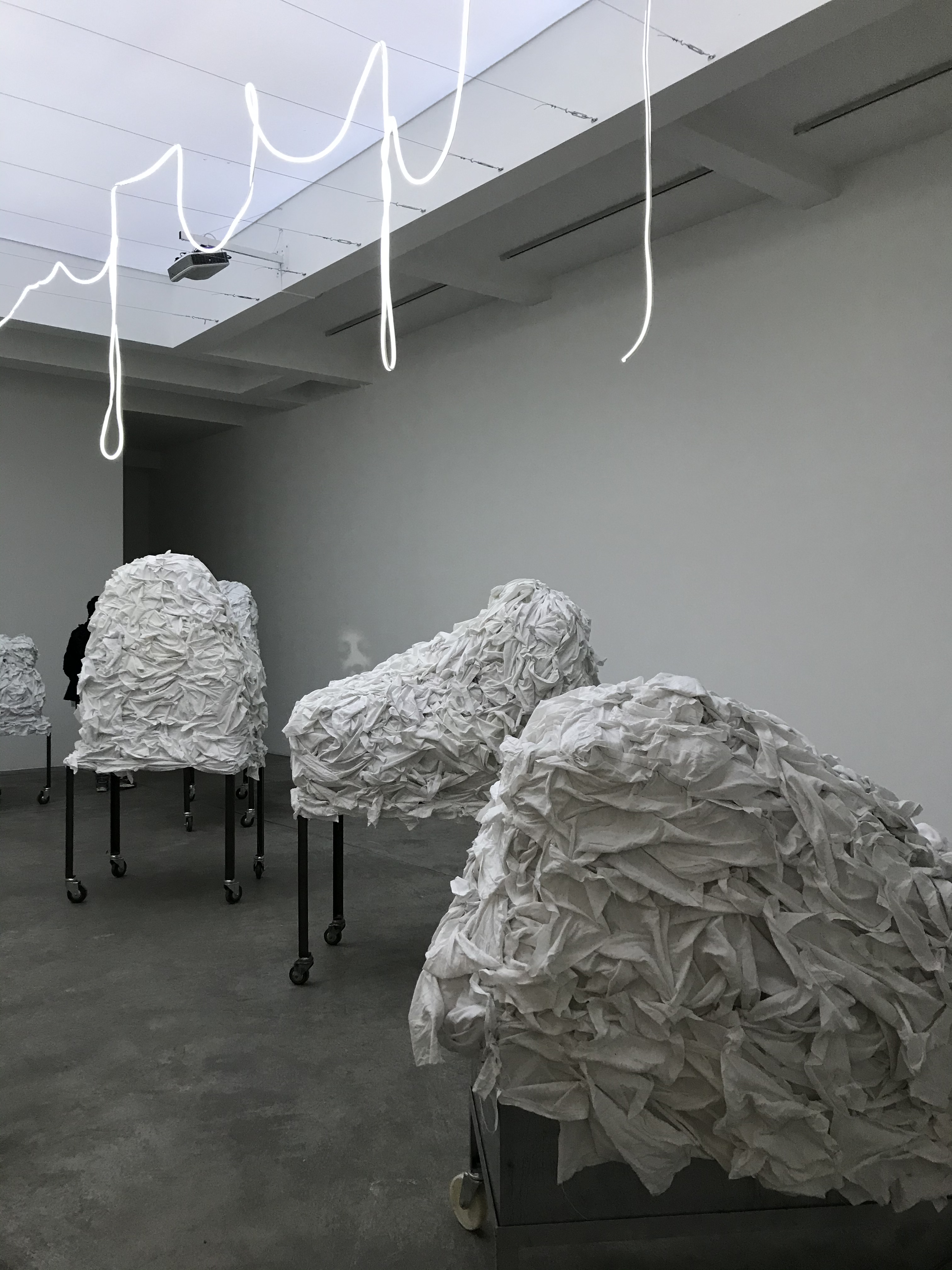 les linges ,installation. Du linge blanc , pêle- mêle, sur des chariots, comme des draps , on pense aux malades à l’hôpital . Les néons suspendus sont comme des tuyaux .