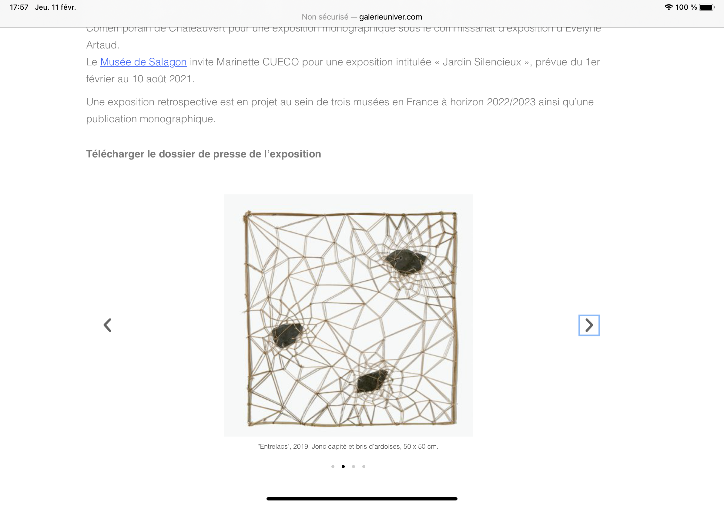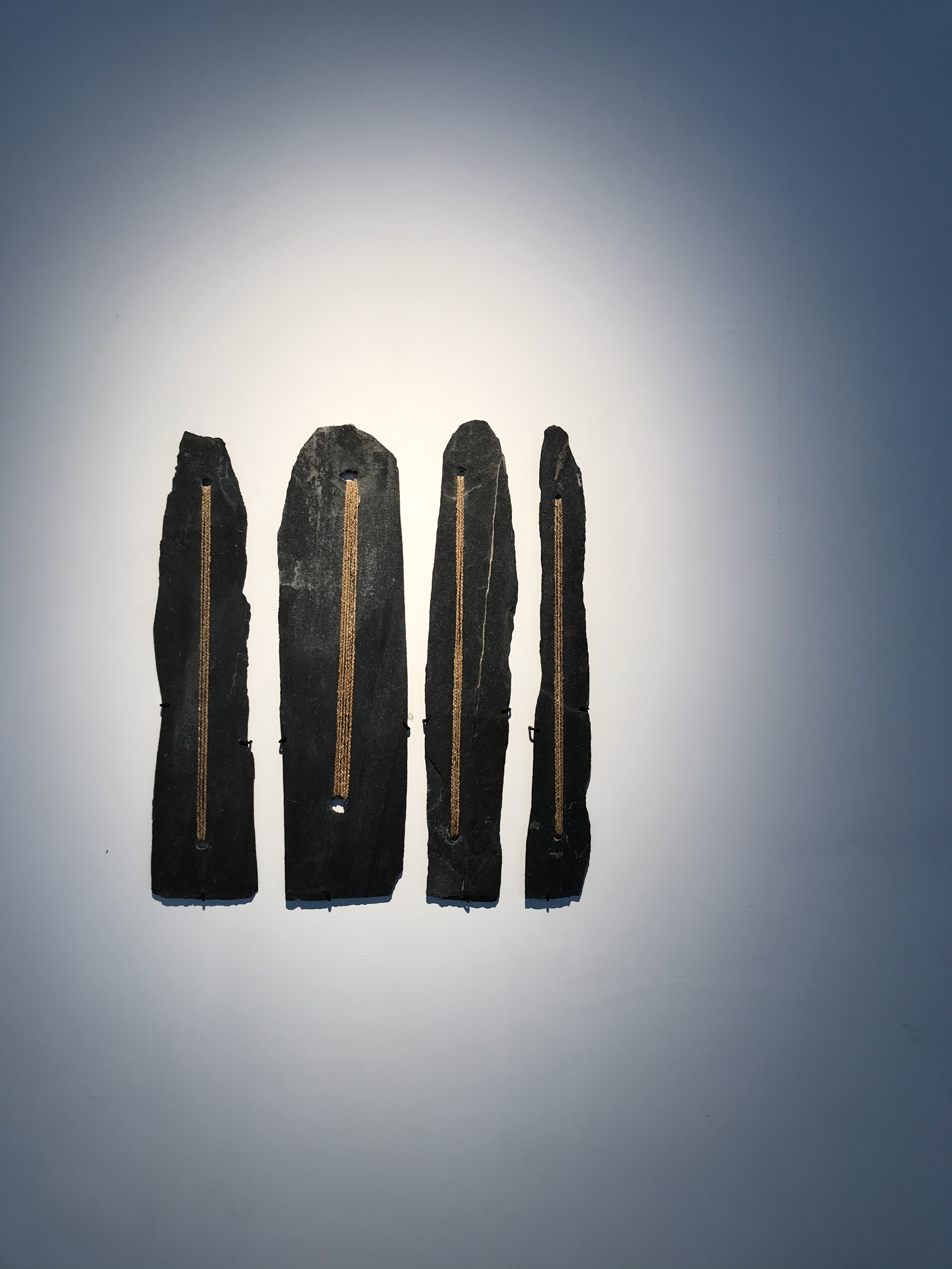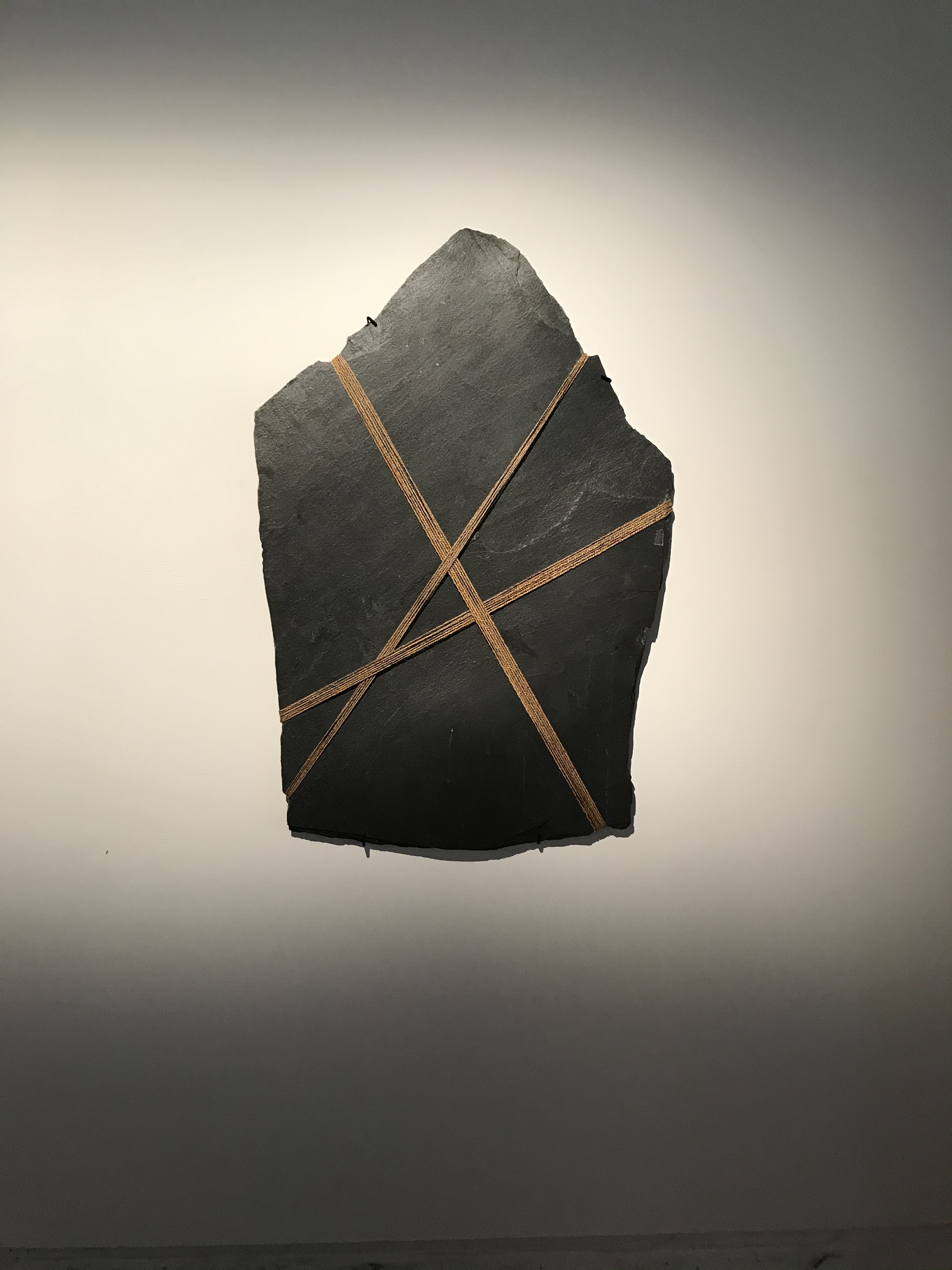3 Marinette Cueco, à la galerie Univer,6 cité , de l’ameublement (12 eme ) Ardoises, entrelacs jusqu’au 11 avril , ouverte à partir de 11h .