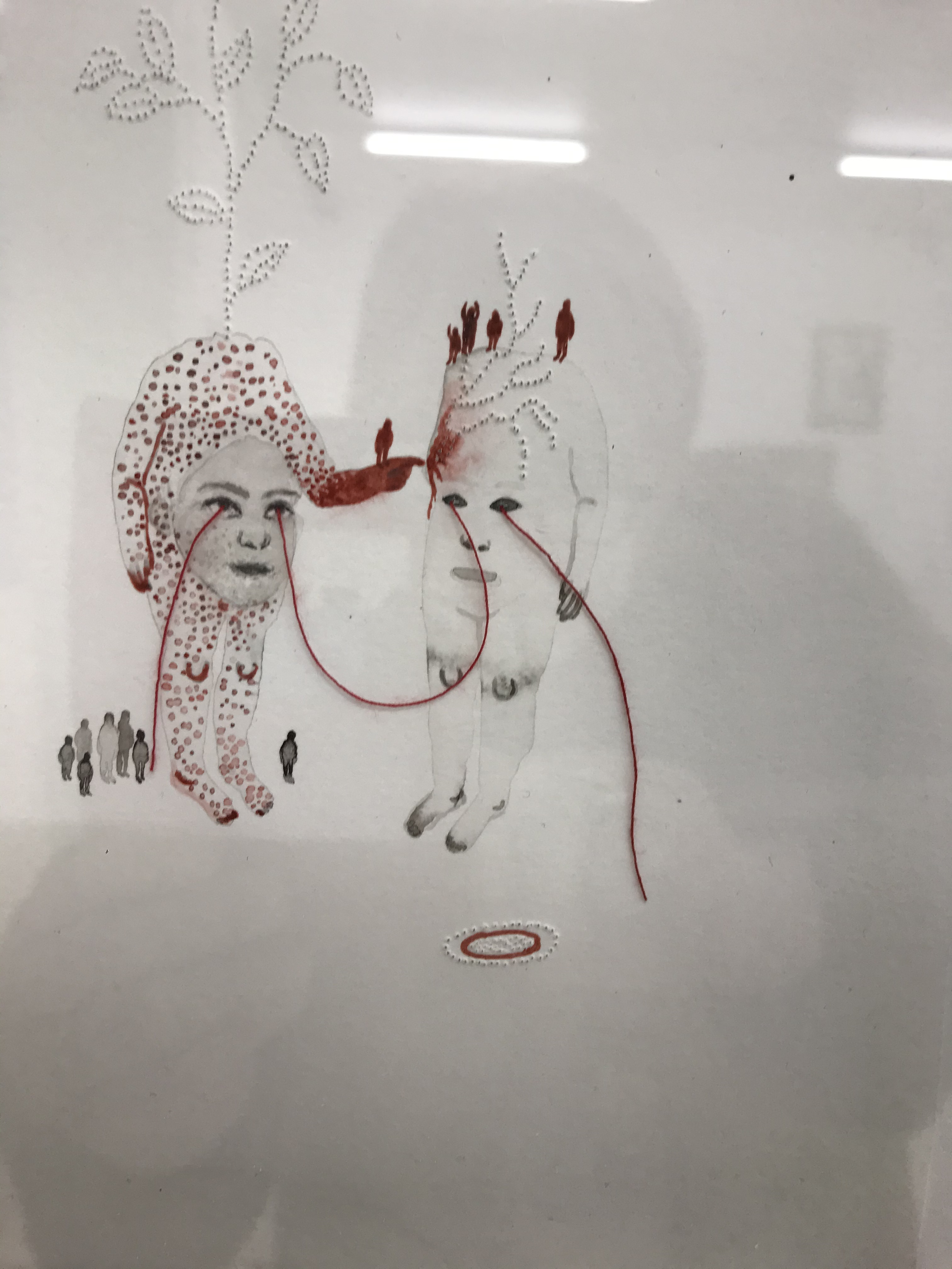 Moi , petite madame PLPDG, je me dirige aussitôt vers les œuvres d’une artiste qui marie finesse du dessin, perforations, fils, tout ce que j’aime . Hélas , hélas , des néons partout, des reflets dans les photos .