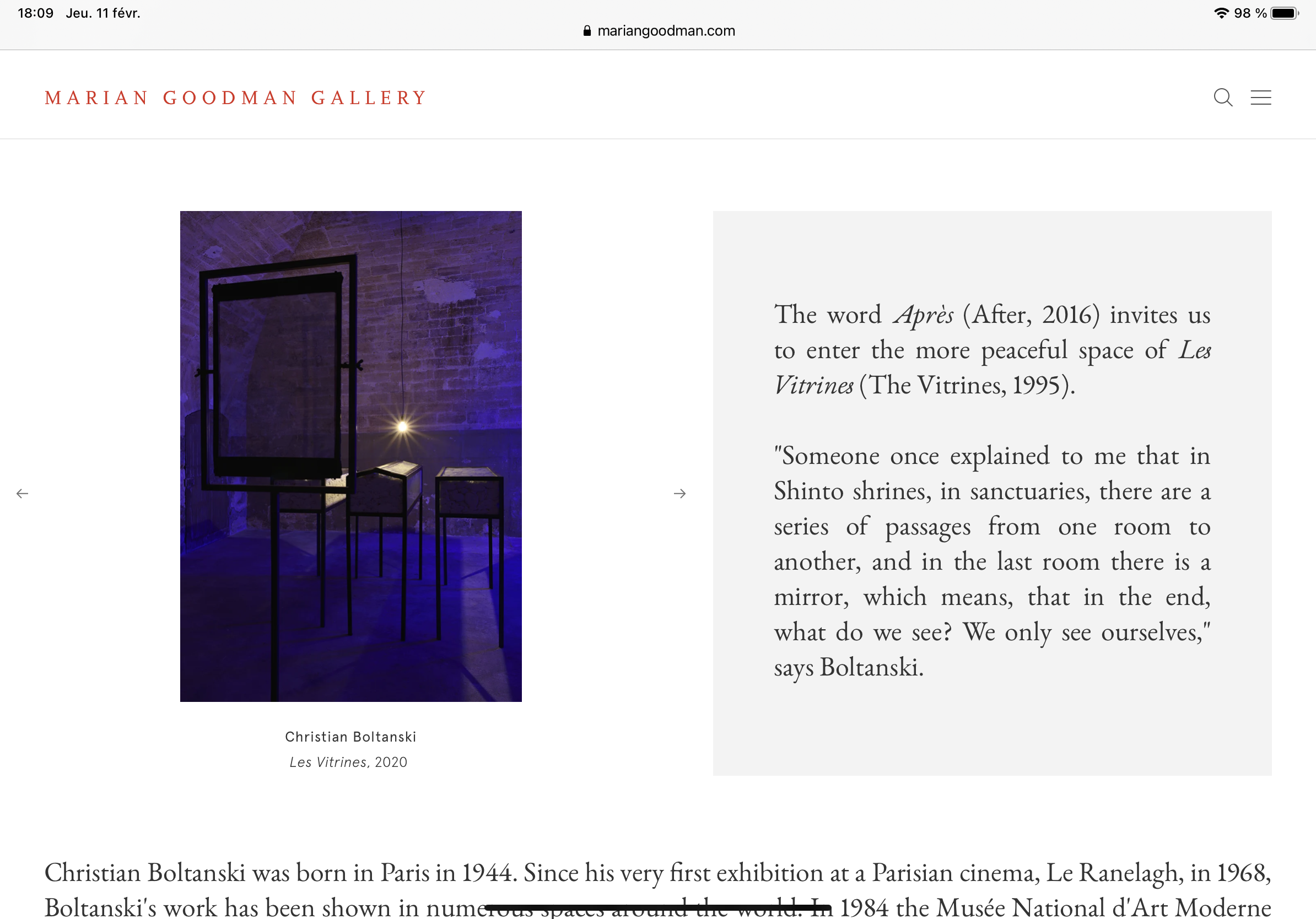 On entre chez les morts , les disparus , avec des vitrines , et comme dans les temples shintoïstes, tout se termine par un miroir ou l’on voit sa propre image .