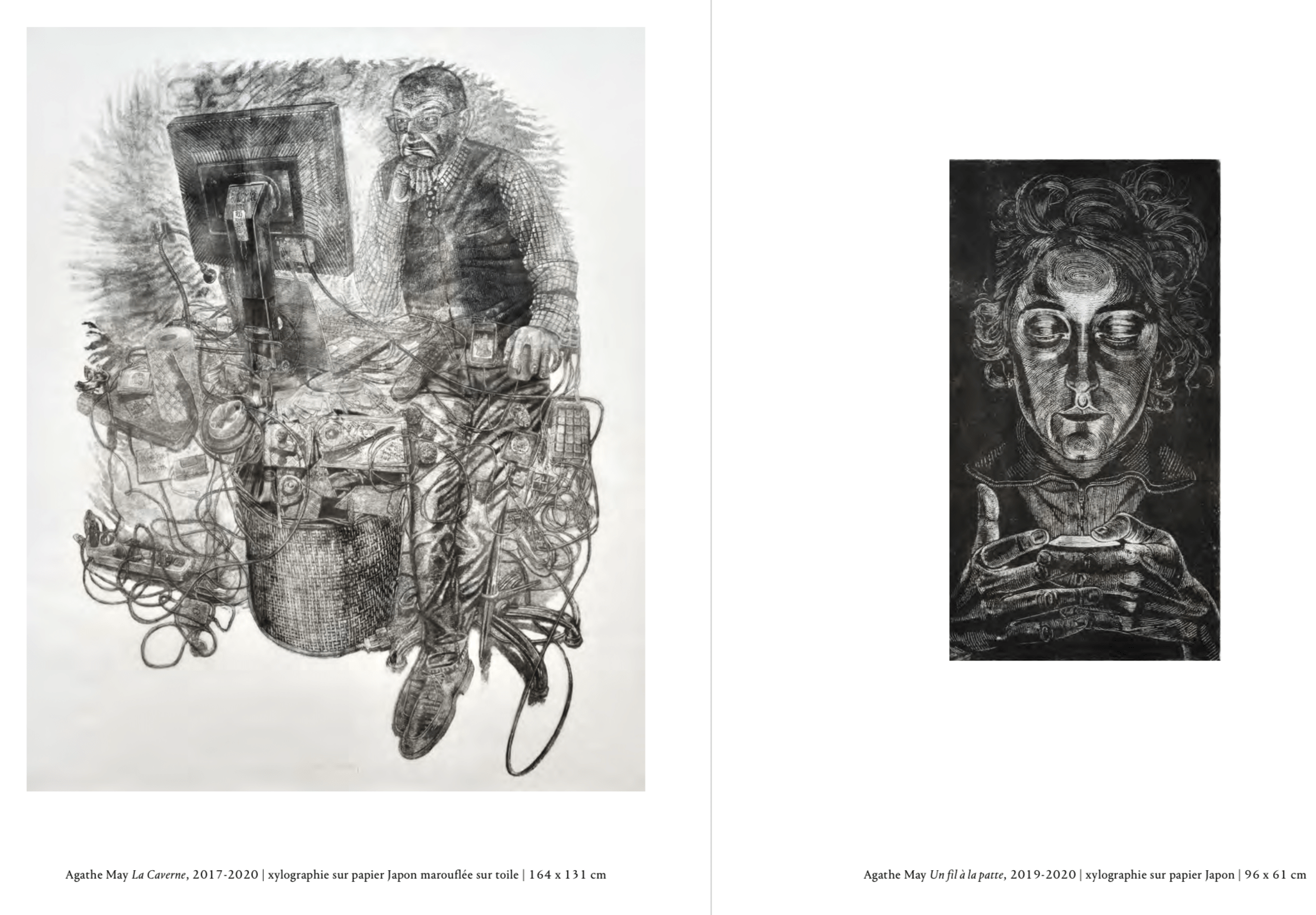 le miroir aux alouettes, xylographies en couleurs et en noir et blanc, ce sont de grands formats , quelquefois oppressants dans leur dénonciation des dérives de notre monde, en ce qui concerne écrans, câbles, branchements .