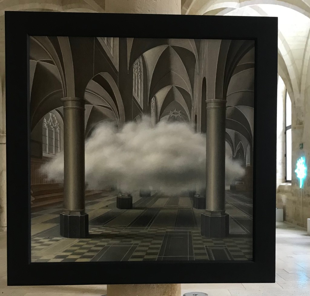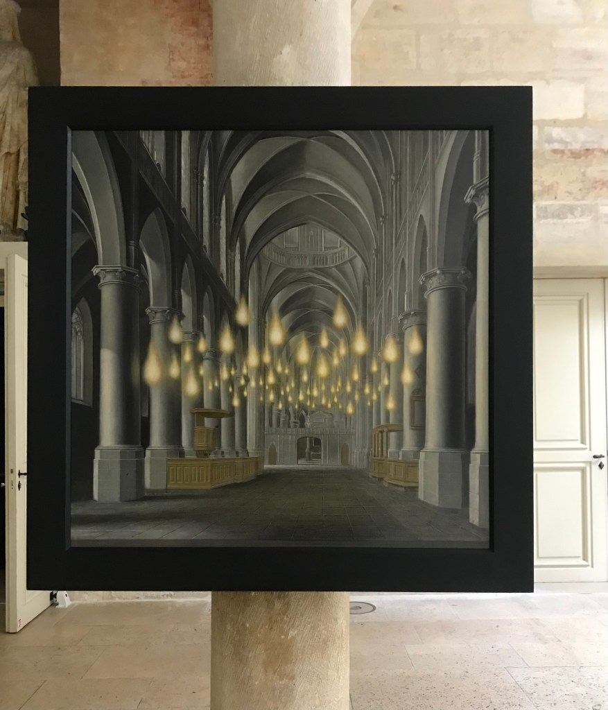 Des huiles sur bois , dans le style des intérieurs d’églises du 17ème siècle hollandais nous accueillent , constellées de nuages et de flammèches
