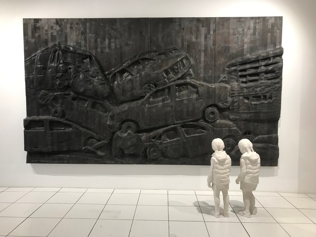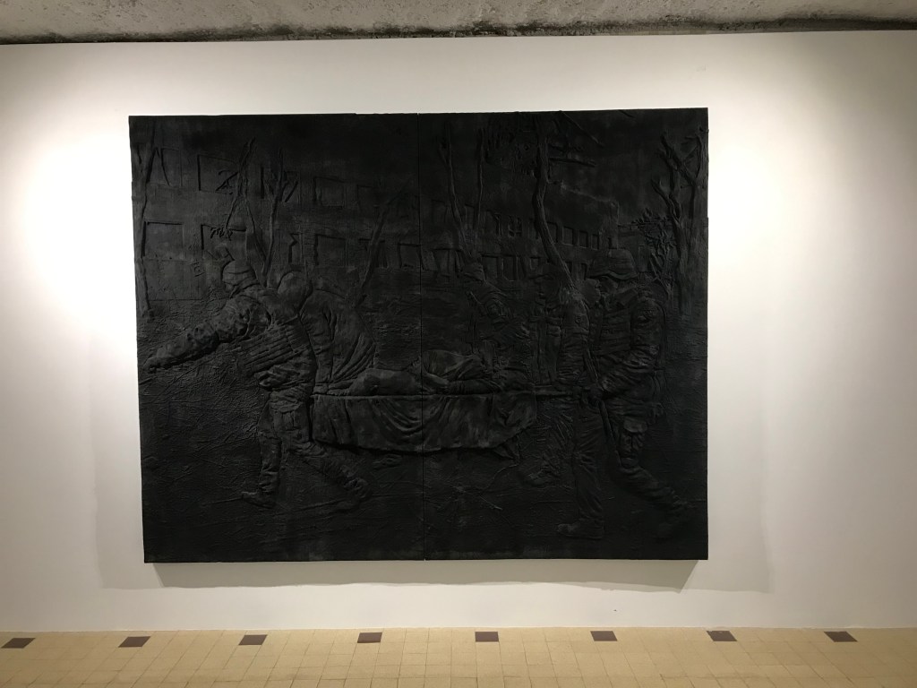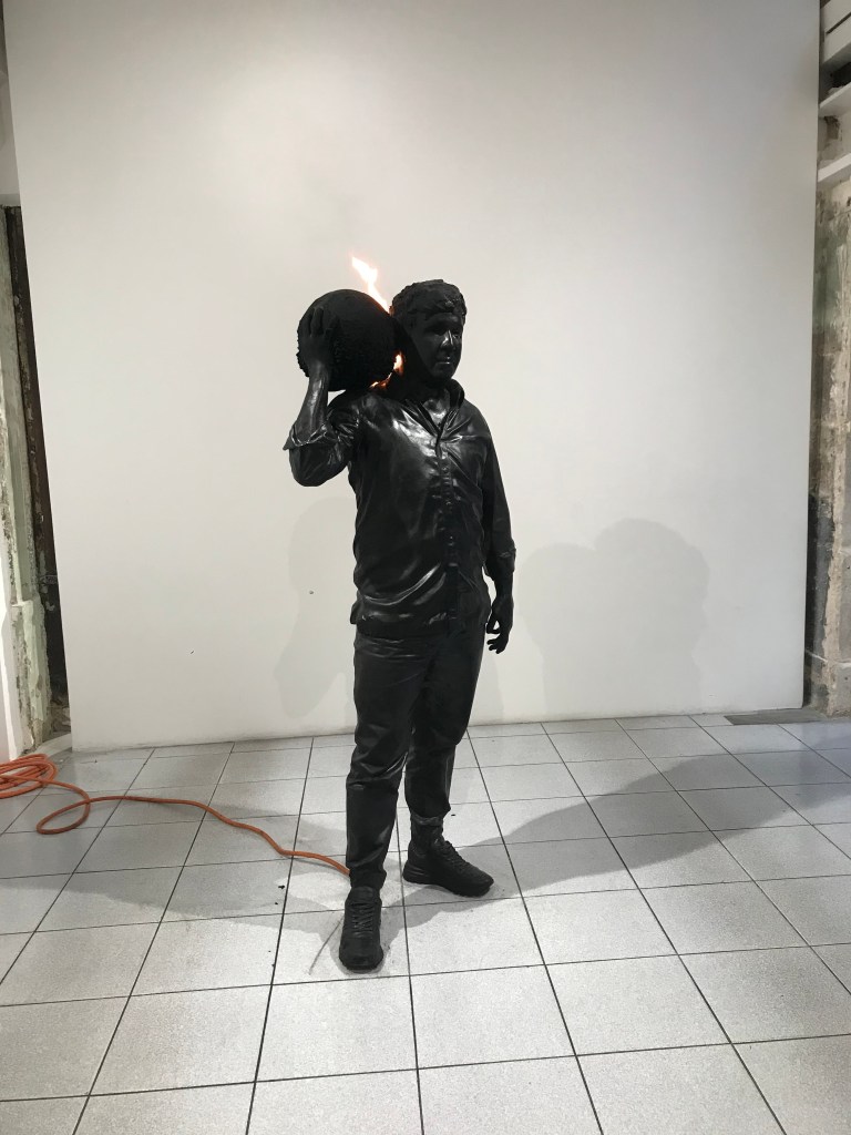 2 galleria continua, 87 rue du Temple ,expose , jusqu’au 21 janvier , le grand Adel Abdessemed ,né en 71 , out, out , brief candle ( éteins- toi , éteins- toi , court flambeau , citation tirée de Macbeth ) .Les différentes salles lui sont consacrées ,sauf deux , ainsi que l’étage, avec video, bas reliefs , sculptures, fusains et sa broyeuse , pour clôre ces images de feu, de guerre en Ukraine , de personnages délaissés ( balayeurs ) , ténèbres contre lumière , pouvoir contre vulnérabilité .