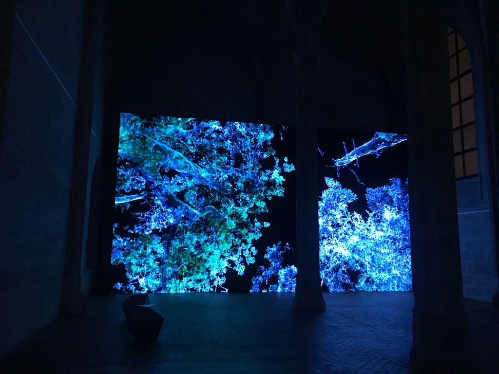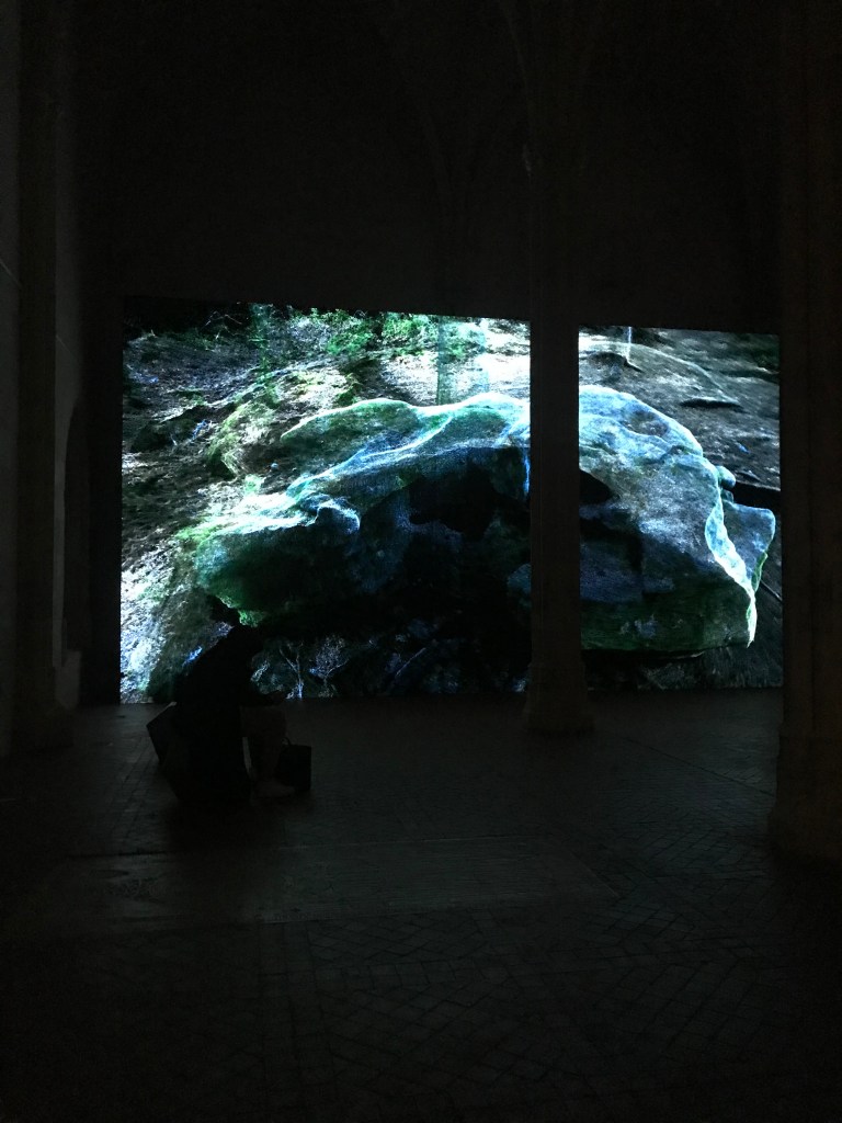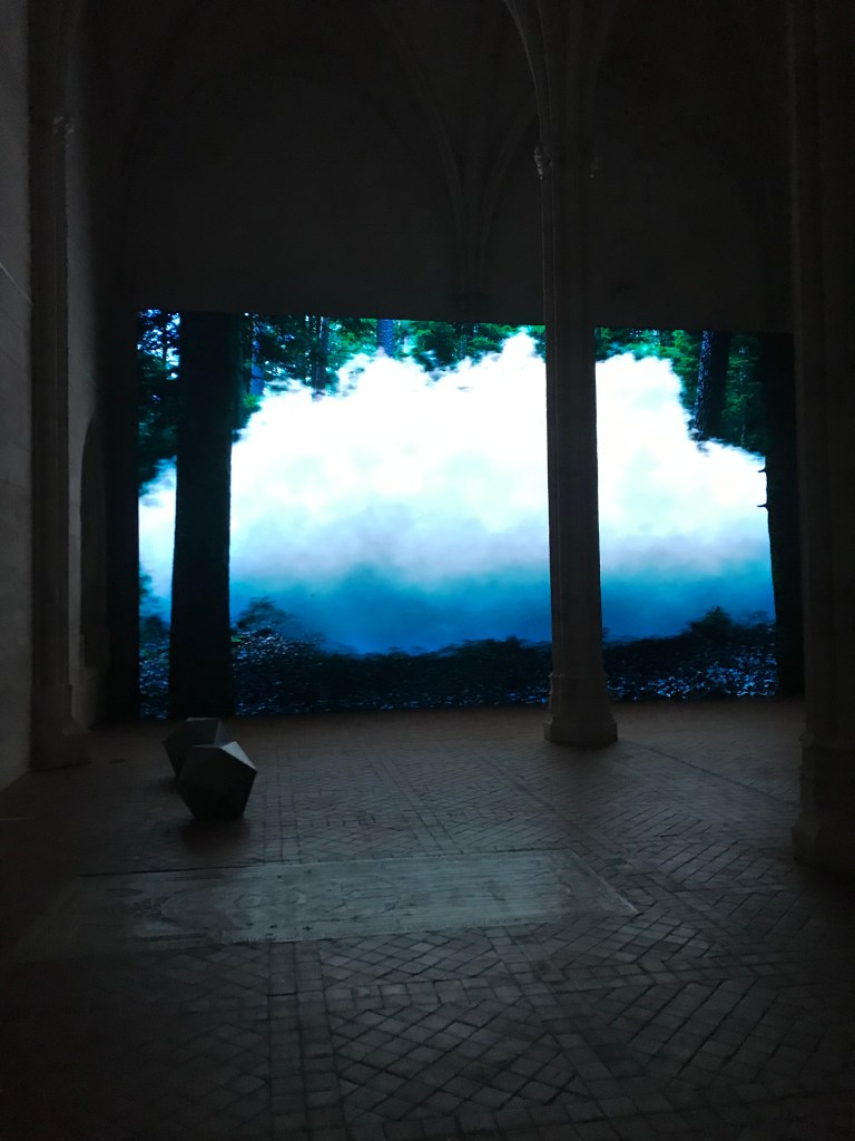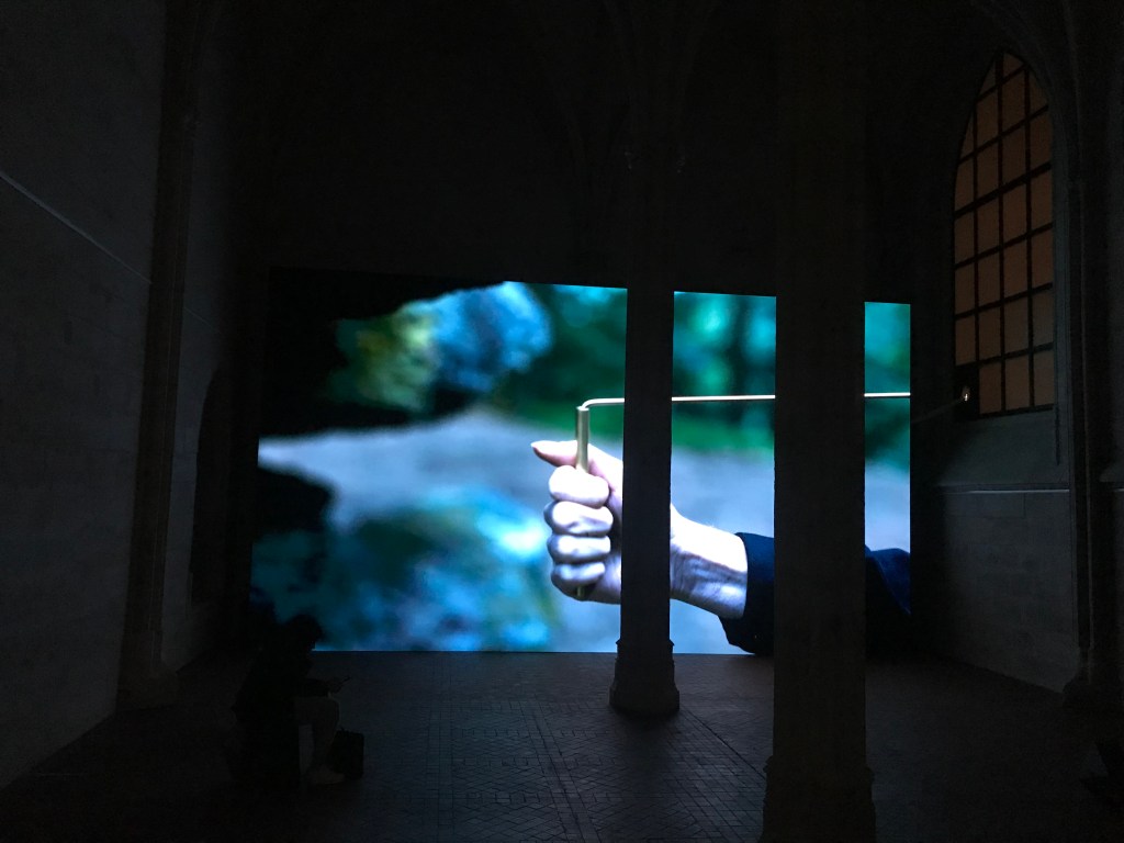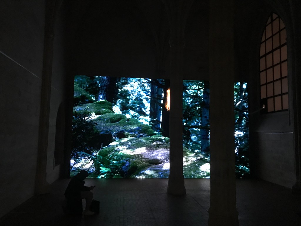 le titre de l’exposition anima est celui de la video que je ne me lasse pas de voir en raison de sa palette de bleus et de verts , de ses points de vue , du renard et du personnage mystérieux , des feux , de cette nature sublimée .