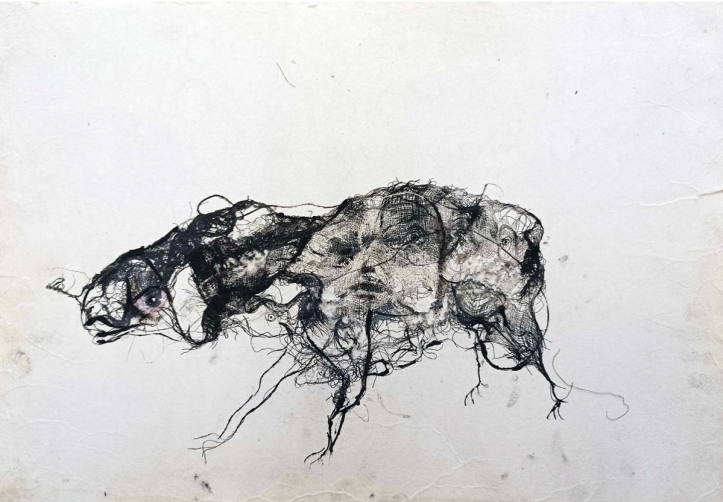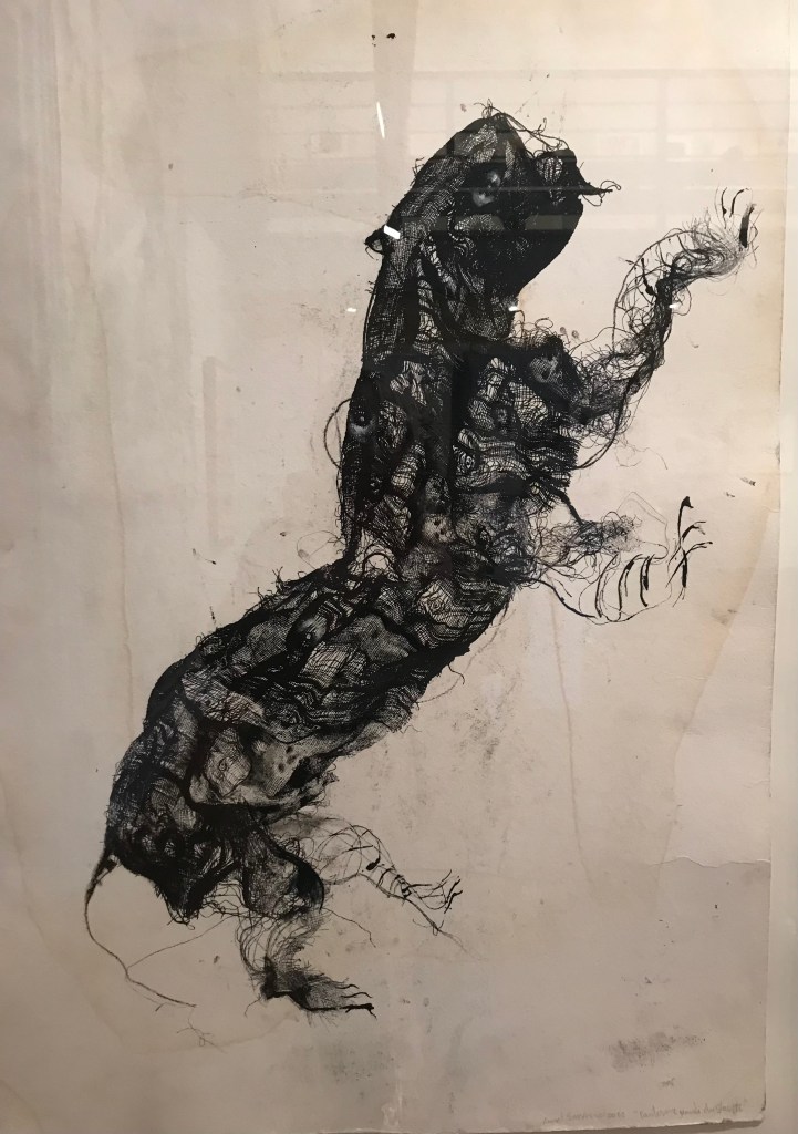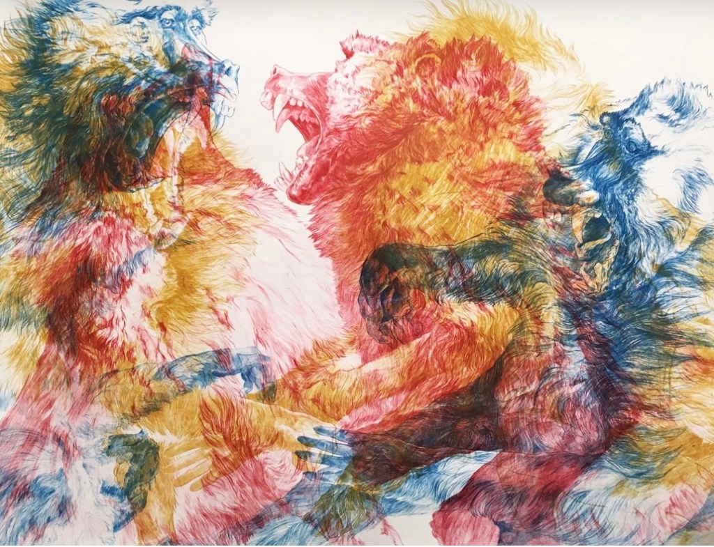 Vous voyez plein de techniques différentes dont celle de Lionel Sabatté, qui travaille en monotype , la talatane encrée, sur support en buvard .