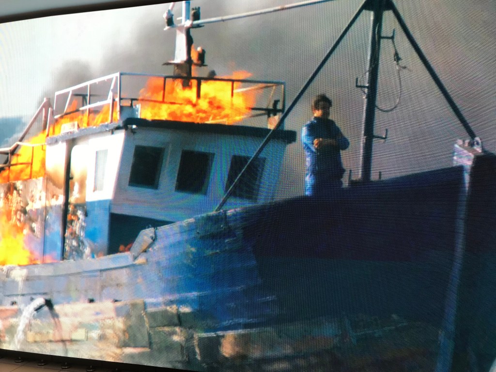 Les bas- reliefs monumentaux, en bois brûlé, sont des scènes de la guerre en Ukraine et l’artiste à la barre dans le bateau en feu continue forcément son périple .