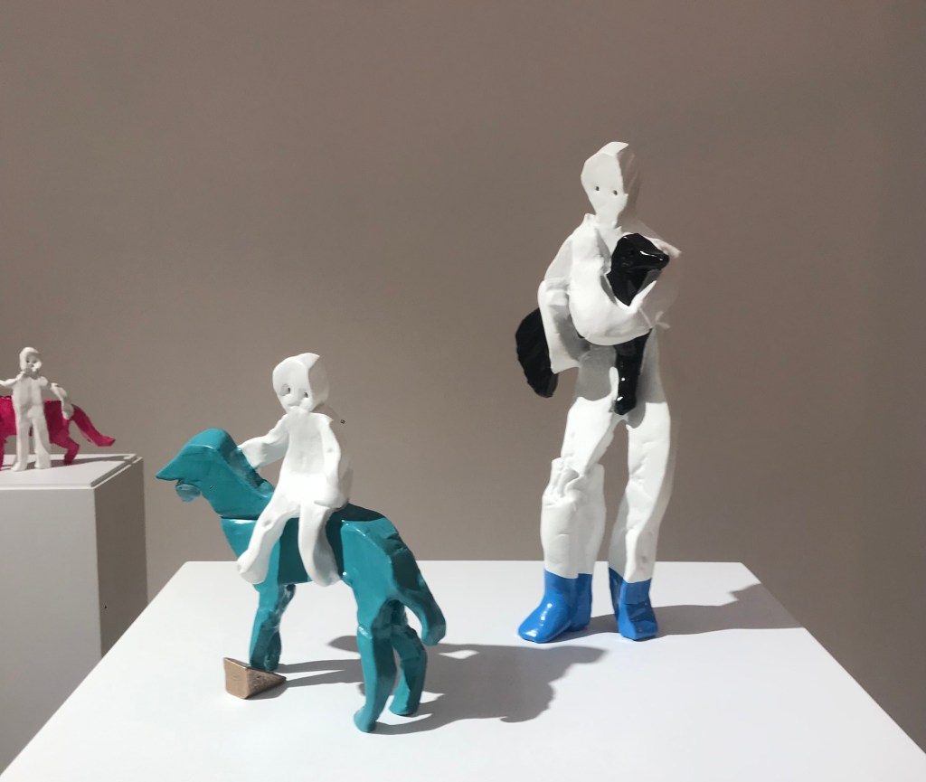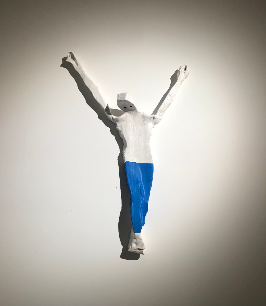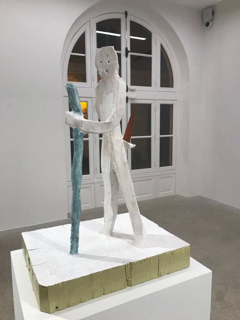 Il fait de petites sculptures , scannées puis agrandies dans des blocs de mélèze et colorées.Il s’intéresse aux nouvelles représentations familiales , à la figure du pèlerin, comme celle de Courbet , mais avec non seulement le baton mais un poignard caché dans le dos , ambivalence de l’artiste qui se représente en serpent