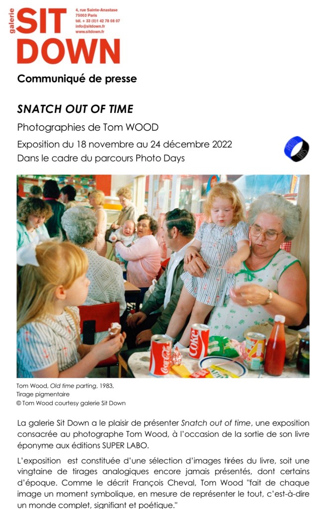 2- On ne va pas très loin , 4 rue saint Anastase , car on apprécie cette galerie consacrée à la photographie contemporaine Sit Down . C’est chez eux que nous avions découvert Tom Wood , de Liverpool , et quelques années après nous avons le plaisir de contempler jusqu’au 14 janvier , sa nouvelle série Snatch out of time , constituée de tirages analogiques de portraits de couples, de familles, d’autres vies et d’autres milieux que les nôtres ,de moments d’illusions , tout ceci , contrairement à Martin Parr , photographié avec une grande empathie .