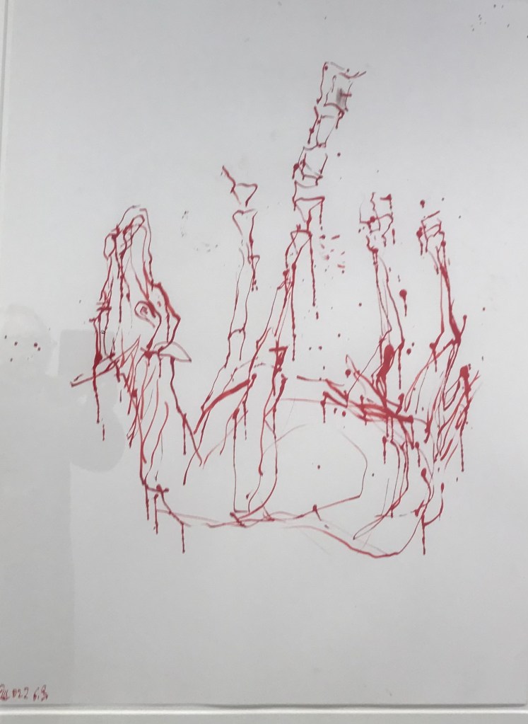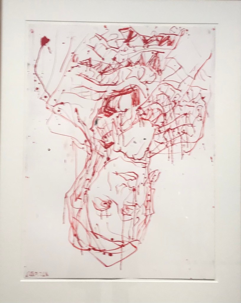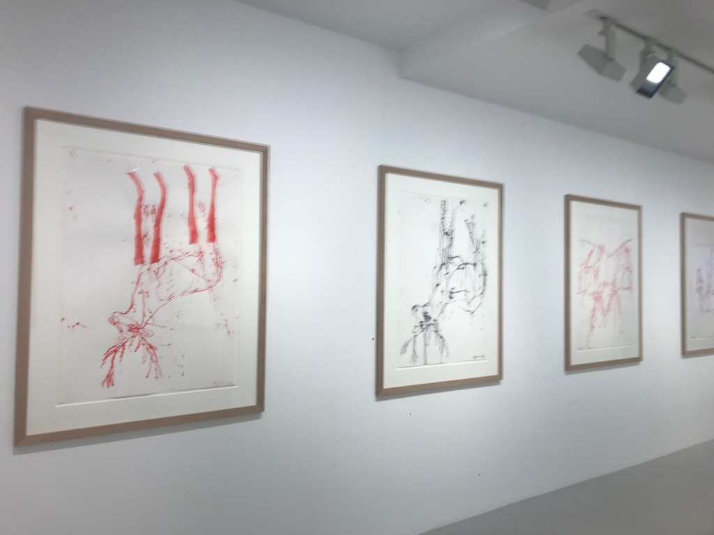 Le premier étage nous convie à admirer les encres rouges sur papier grand format de Georg Baselitz, représentant des portraits ( sa femme Safe Eke ) des corps , des danseurs , des animaux .