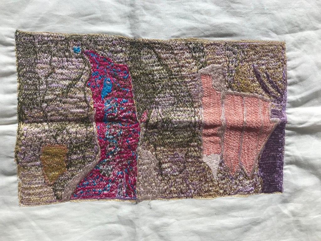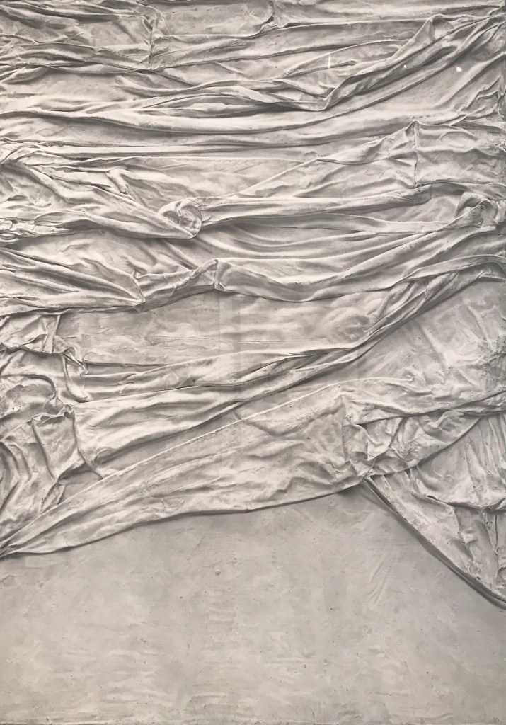 un petit morceau d’étoffe violette d’Ymane Chabi-Gara qui revisite en peinture des friperies avec sa palette bien particulière et en grands formats .