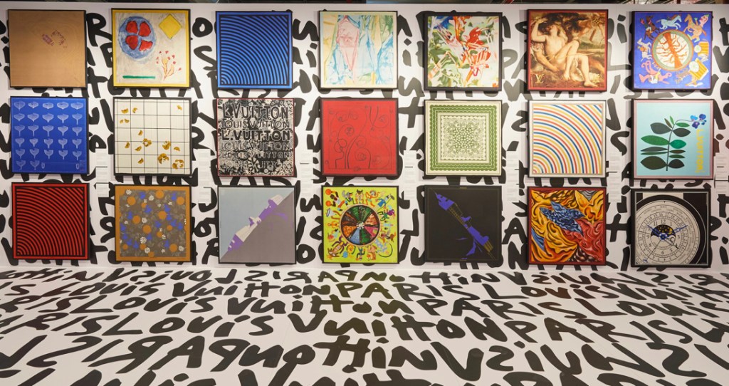 On y voit , pour commencer , des portraits revisités de Luis Vuitton , par Alex Katz ou Yan Pei- Ming , entre autres , des malles iconiques ( la malle médicale de Damien Hirst ou celle qui a permis de transporter la laitière de Vermeer jusqu’au Japon etc ) , les carrés de soie commandés a Sol Lewitt, James Rosenquist, Gae Aulenti, Andrée Putman, Urs Fischer …