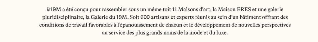 C’est le 19M des métiers d’art de Chanel , Gossens,Eres , corsetterie, tissus plissés à la main , brodeur , plumassier, bottier , gantier ,avec 600 salariés , lieu d’ateliers , de conférences et d’expositions dans sa galerie ( gratuite , sur inscription ) .