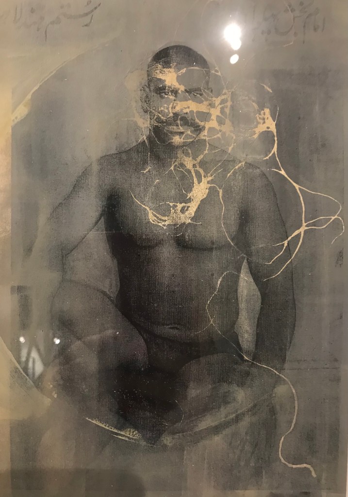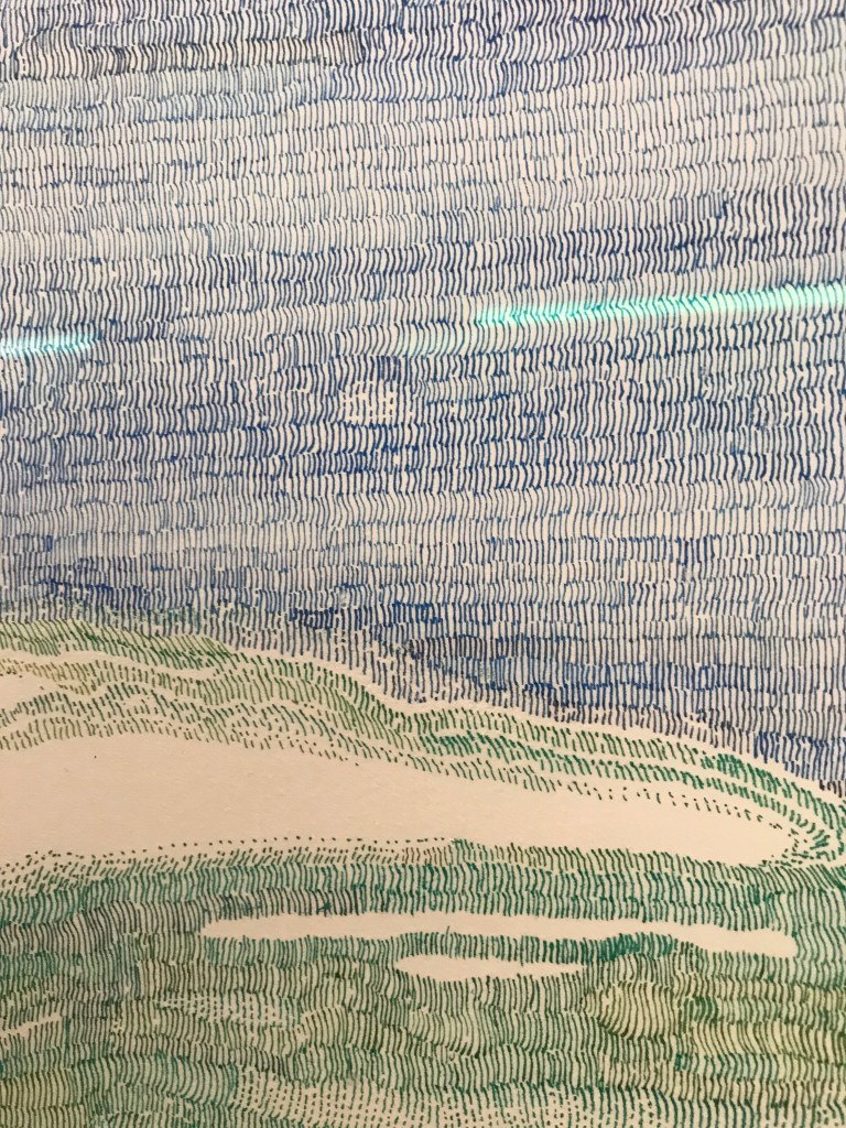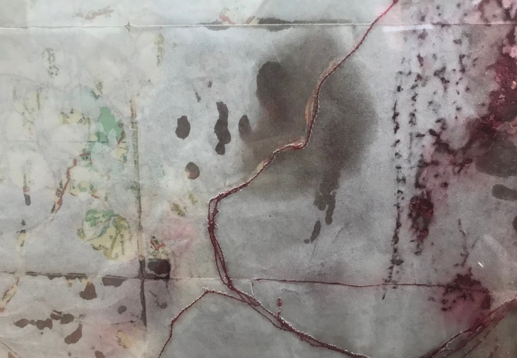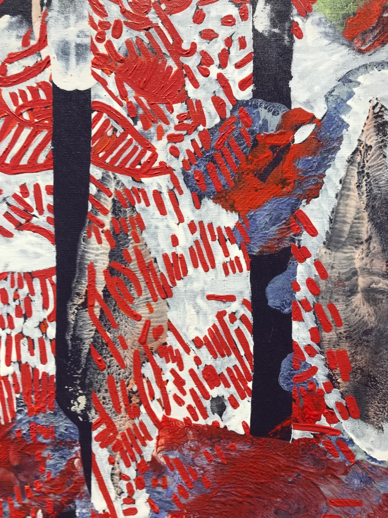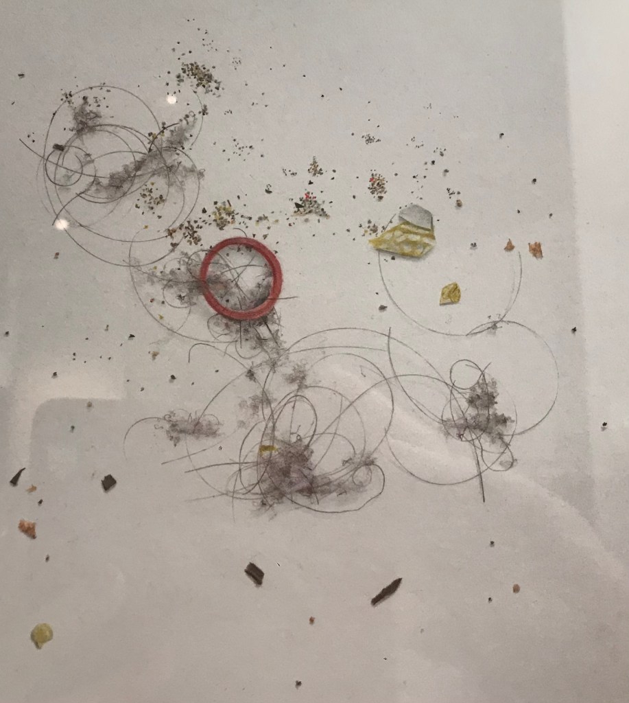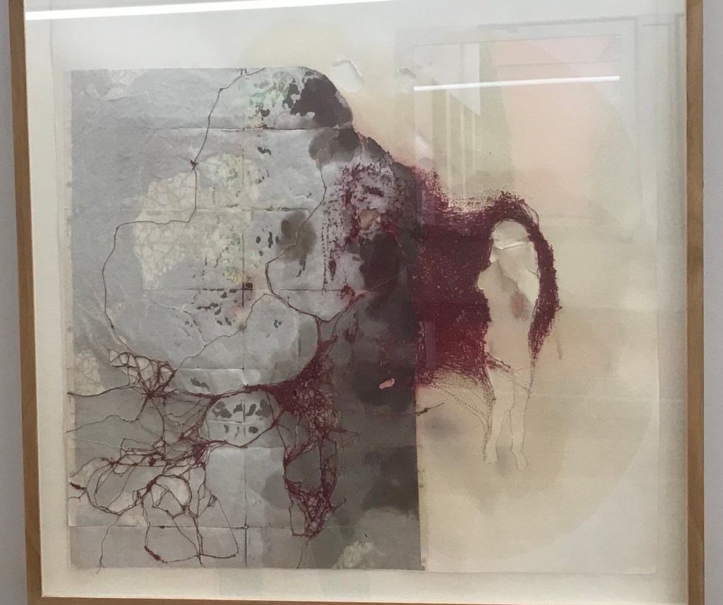 Vous reconnaissez Clement Bagot et ses encres de couleur , Lionel Sabatté ( poussière, acrilyque , huile et curcuma sur papier noir de Pierrette Bloch datant de 1969 ), le très beau travail de Cathryn Boch, ( gouache , huile ,carte routière couture machine au fil de coton rouge sur papier troué, poncé ) ,les oiseaux de Jochen Gerner, bien sûr Benchamma dans le style de ce qui est présenté actuellement chez Templon, une partie d’un triptyque de Nicolas Daubanes et sa poudre d’acier aimantée .