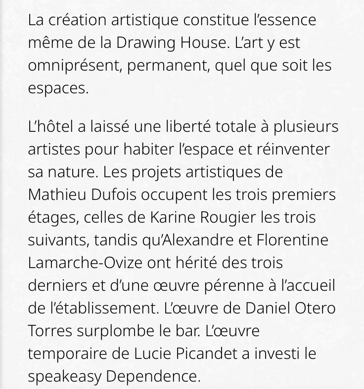 Un autre hôtel ancien a été racheté, près de la place de l’étoile et est en réfection , on y avait vu une expo ,dans cette drawing factory , en 2021 ,chacune des chambres étant dévolue comme atelier-galerie à un artiste en résidence pendant 6 mois , sous l’égide de la présidente Christine Phal, fondatrice du drawing lab qui déclare: