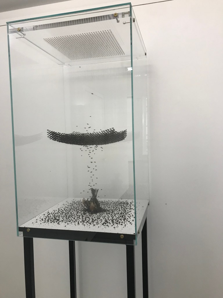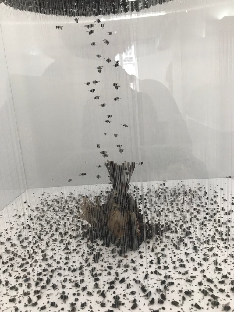 A l’entrée on est accueilli par une cage blanche vide ( installation ) et ce poème qui nous parle de disparitions .