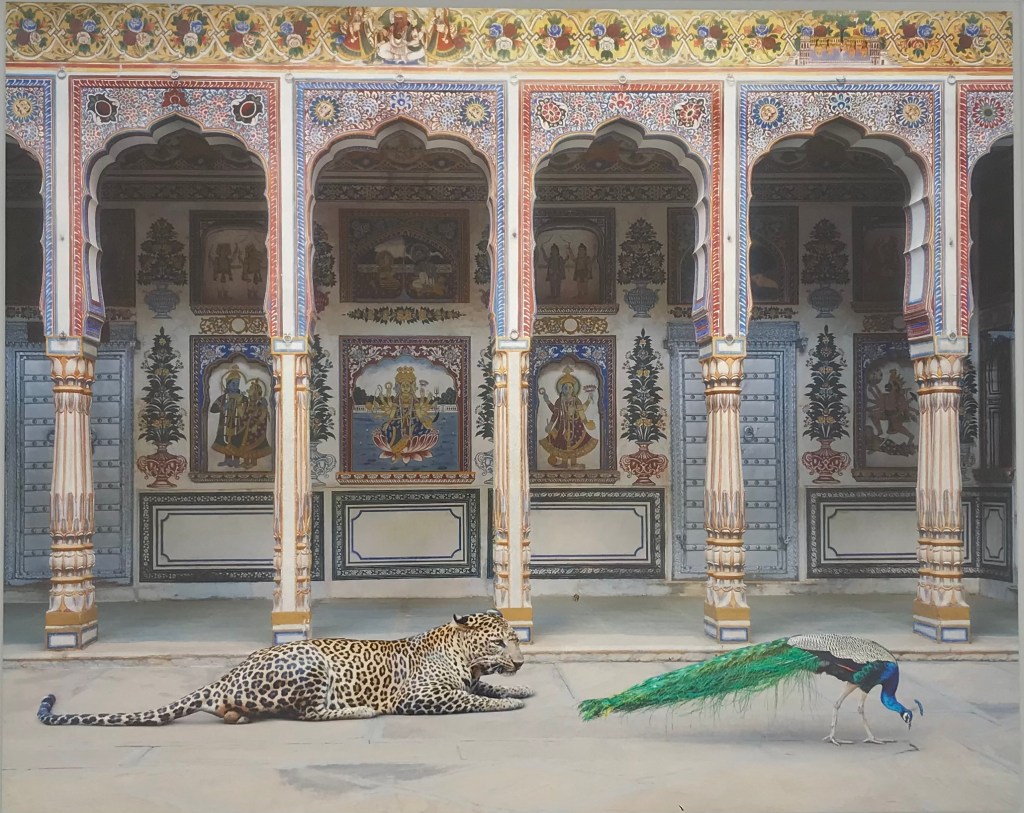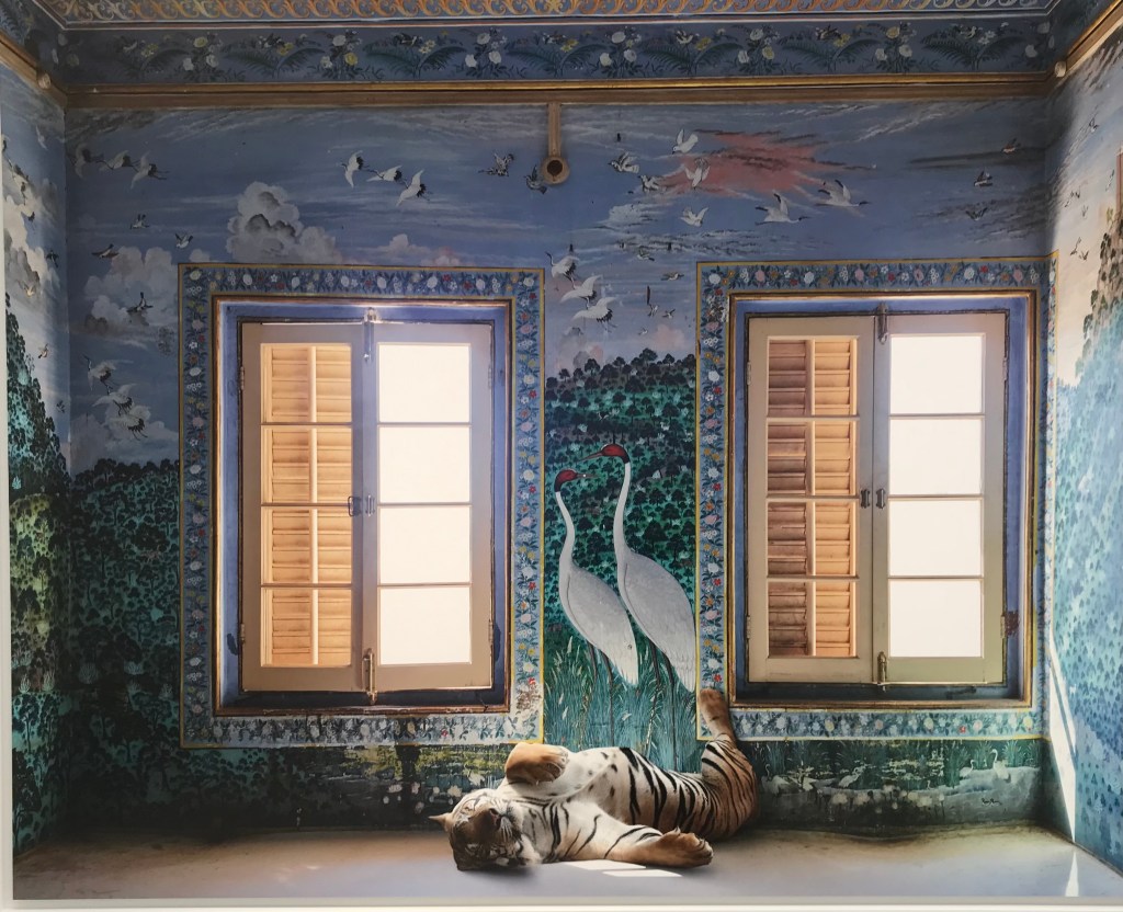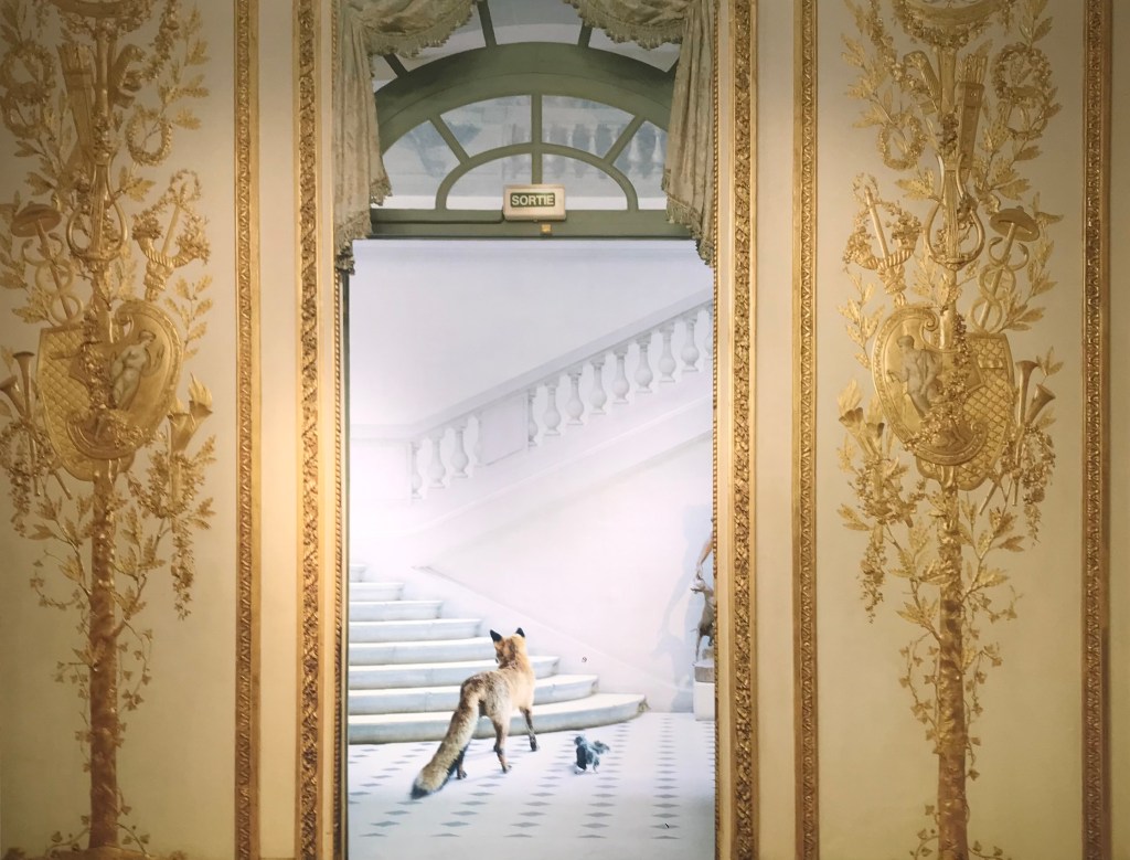 On retrouve ce qui a fait sa célébrité , ses mises en scène d’animaux (empaillés ou inserés par collages et retouches numériques )qui, de façon incongrue et improbable , se promènent ou se délassent dans des lieux somptueux , vides d’humains, musées , palais , en France , en Inde .Ce bestiaire de fable fait écho à l’ornement des lieux , en tirages monumentaux , c’est de la fiction en contradiction avec le caractère supposé de l’effet de reel de la photo .
