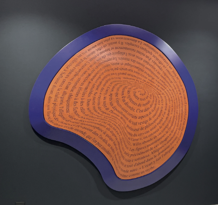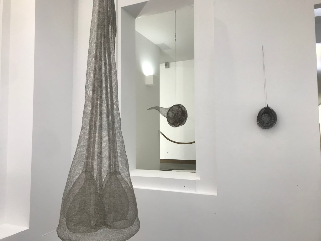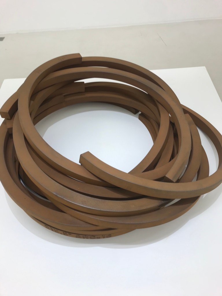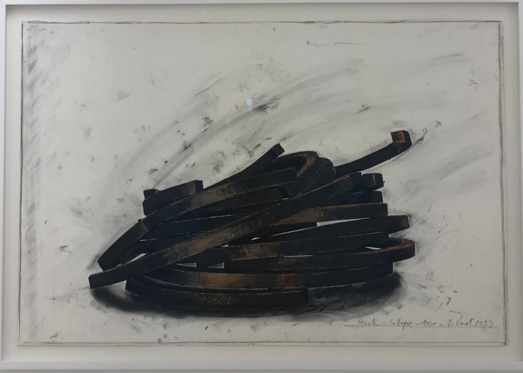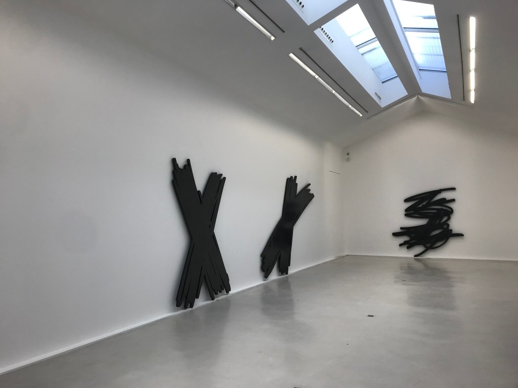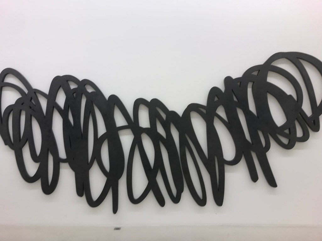 Sculptures ,non monumentales , deux sortes de métal , l’un noir en relief aux murs , l’autre , acier corten , au sol , en volume et oeuvre sur papier . Calligraphies , études géométriques , réflexions sur lignes , courbes et espace .