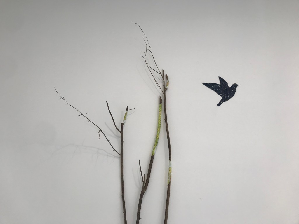 Et tout le monde aime kosmos 69 de Baumgarten , ses branches de noisetier et la figure d’un oiseau de papier recouvert d’une carte de constellation