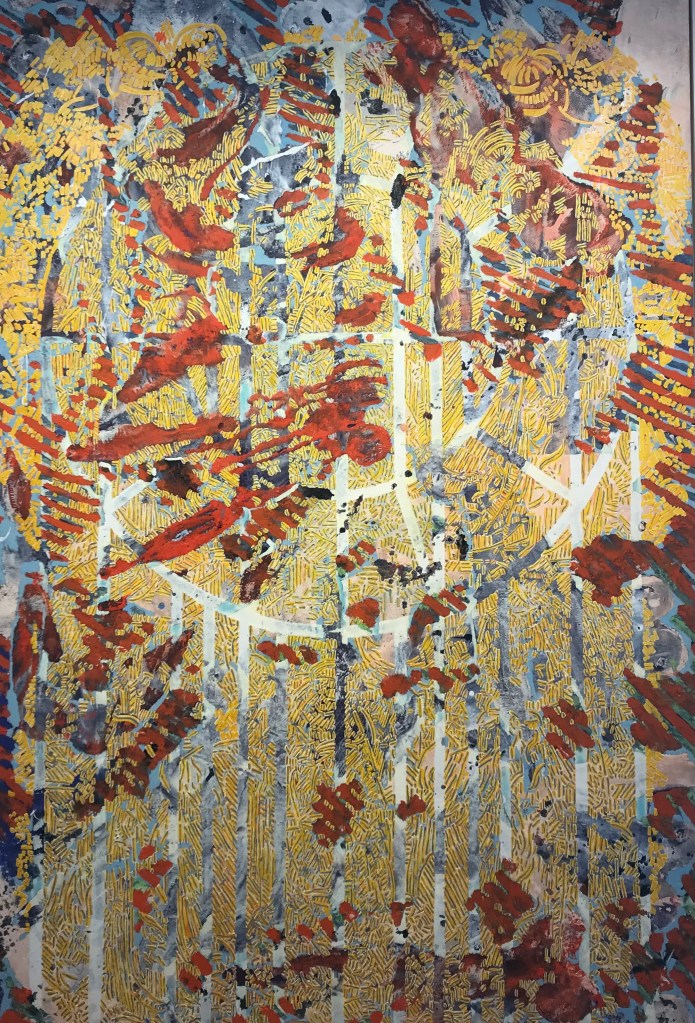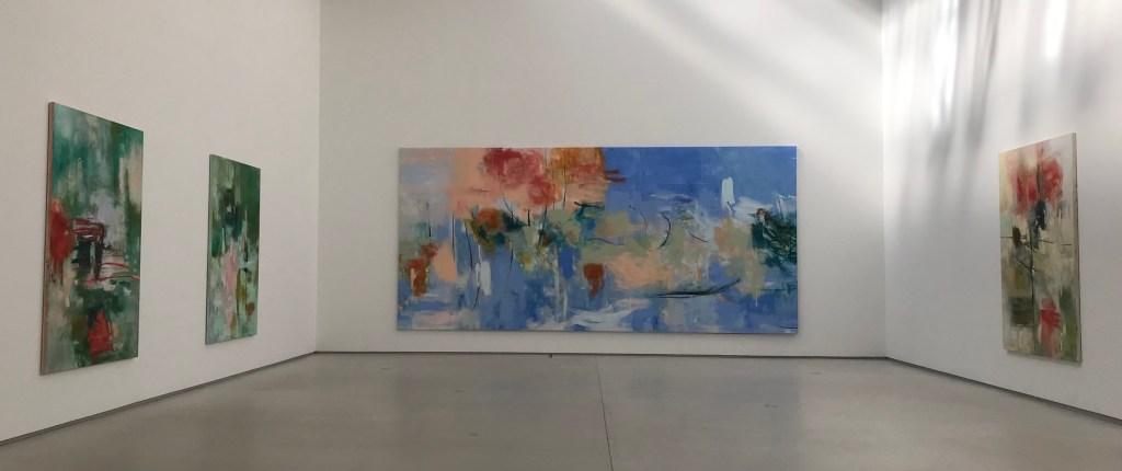 7 femmes artistes , de tous âges, de nationalités et cultures différentes :américaine ,japonaise , brésilienne ,suisse , allemande , écossaise,et irlandaise ! Et de styles dissemblables , minimalisme ,motifs abstraits et rythmés , luxuriance ,expressionnisme abstrait ,et d’états d’esprit qui vont de la contemplation , à l’hymne à la splendeur du monde, au rapport avec l’animal ,à la menace tragique qui pèse sur le monde . Quelle disparité ! C’est cela la caractéristique de l’art de notre époque ? Pas de rassemblement autour d’une thématique , d’une technique , d’un genre .Mais des constellations libres , non rivales .