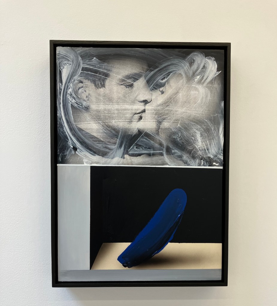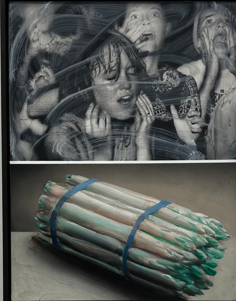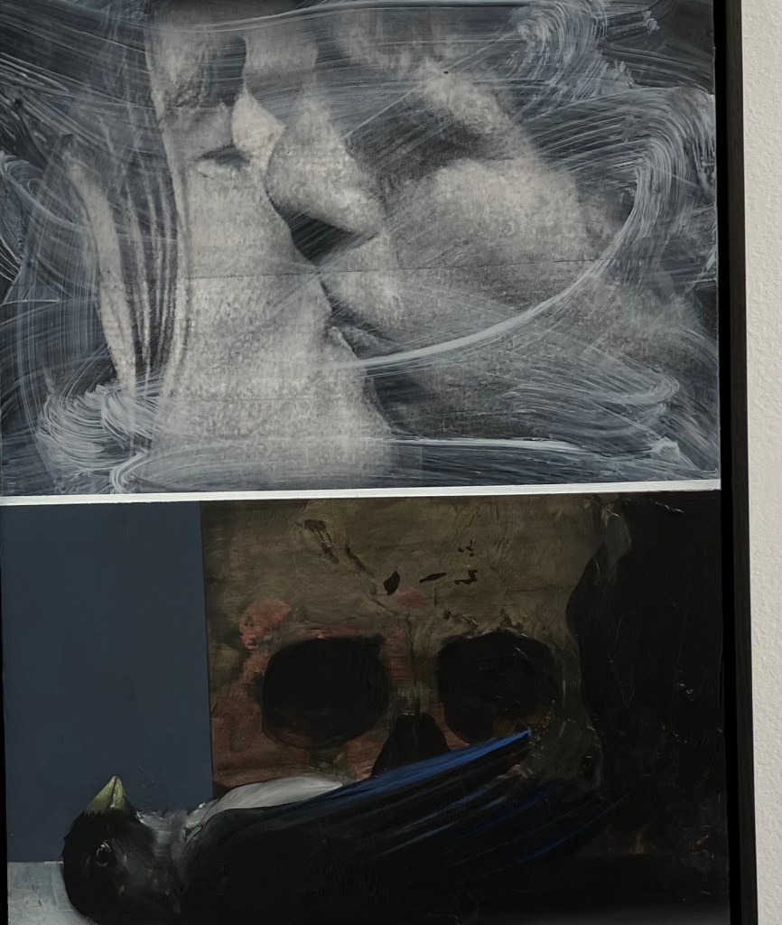 En deux parties , dans la partie supérieure en noir et blanc , des scènes d’extases , de baisers, montrant des malades mentaux , qui expriment anxiété religion , hystérie collective ,la peinture blanche voulant estomper la perfection des impressions , et la partie inférieure en couleur insistant sur des symboles ou des gestes abstraits , a nous de construire nos récits et interprétations .
