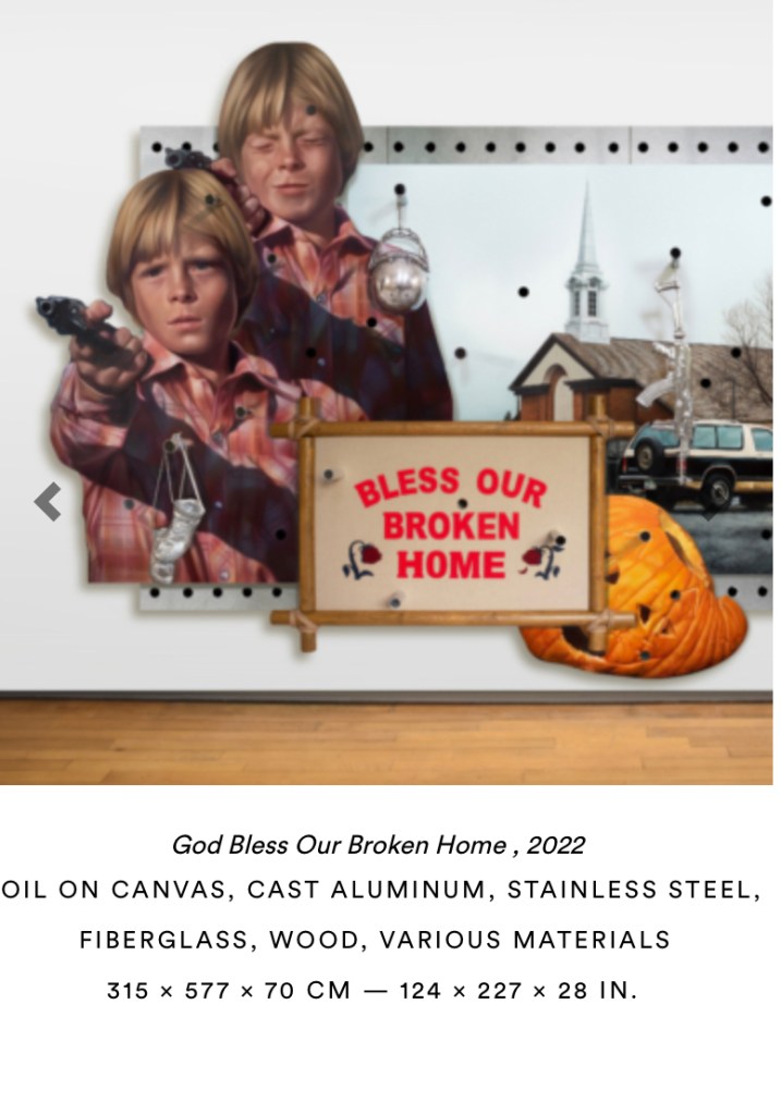Comme vous le voyez il s’agit d’œuvres hybrides de très grand format ,peintures à l’huile , panneaux d’acier , sculptures , installations, avec texte , qui explorent les souvenirs , l’enfance , la nostalgie ,le temps passé, mêlés à la pub , internet ,créant ainsi des narratifs spéciaux .