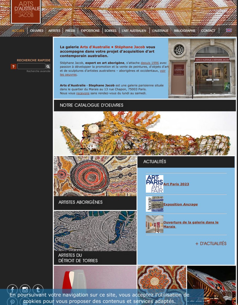 6 –Je vous recommande la rue Chapon , intégralement et particulièrement la galerie de Stephane Jacob , expert en art aborigène Arts d’Australie , son assistante et lui se feront un plaisir de vous donner toutes les explications , régions , ethnies , techniques , représentations des rêves , ou des points d’eau . Vous avez sans doute vu au Musée du quai Branly songlines, chants des pistes du désert australien , tout est de cette qualité là , Stephane Jacob étant l’expert qui a été chargé de l’acquisition des pièces aborigènes lors de la création du musée des confluences , à Lyon .Je me permets de signaler qu’il donne tous les mois une conférence gratuite en ligne ,un jeudi , la même à 12 h et 18 h , sans replay . Il suffit de s’inscrire , on y apprend énormément de choses , je suis moi- même une fidèle depuis le confinement et je n’en finis pas d’être intéressée, car ce galeriste éprouve une vraie passion pour ces artistes australiens qu’il partage avec nous .