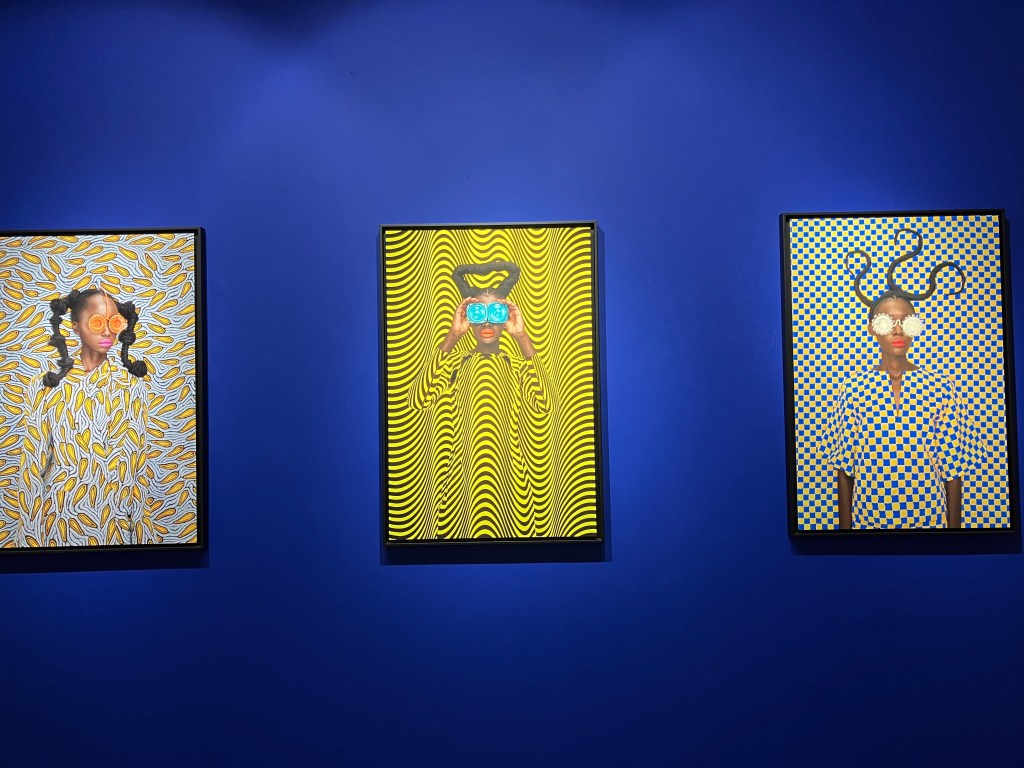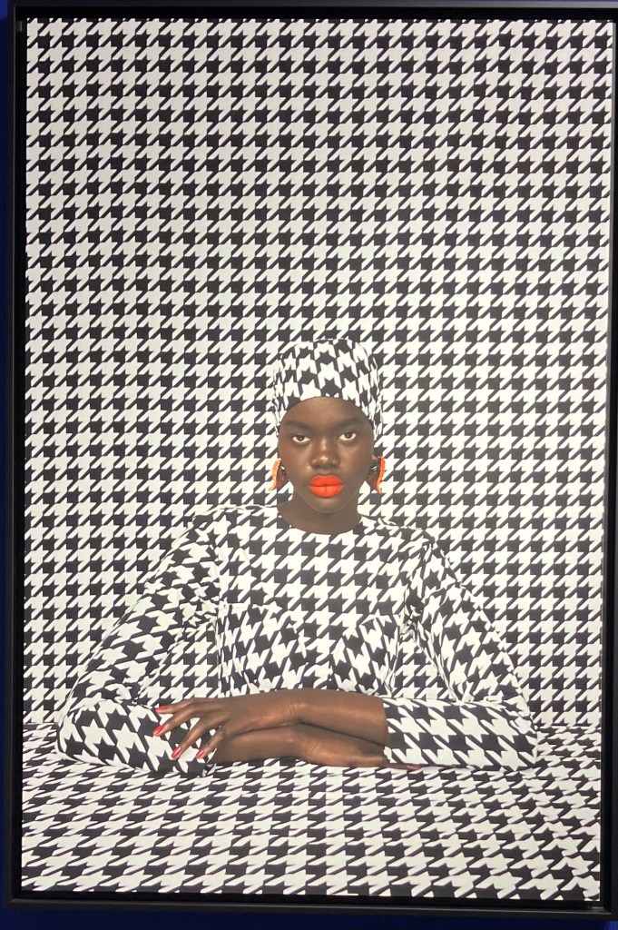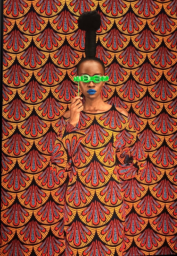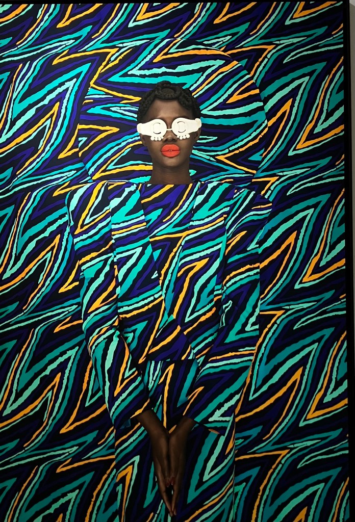 Les femmes sembleraient être juste un élément de leur environnement , vêtues du même tissu traditionnel que le fond , mais chacune a fait le choix d’une coiffure sophistiquée et traditionnelle , de ses gestes , de la couleur de ses lèvres et de lunettes particulières et très colorées .