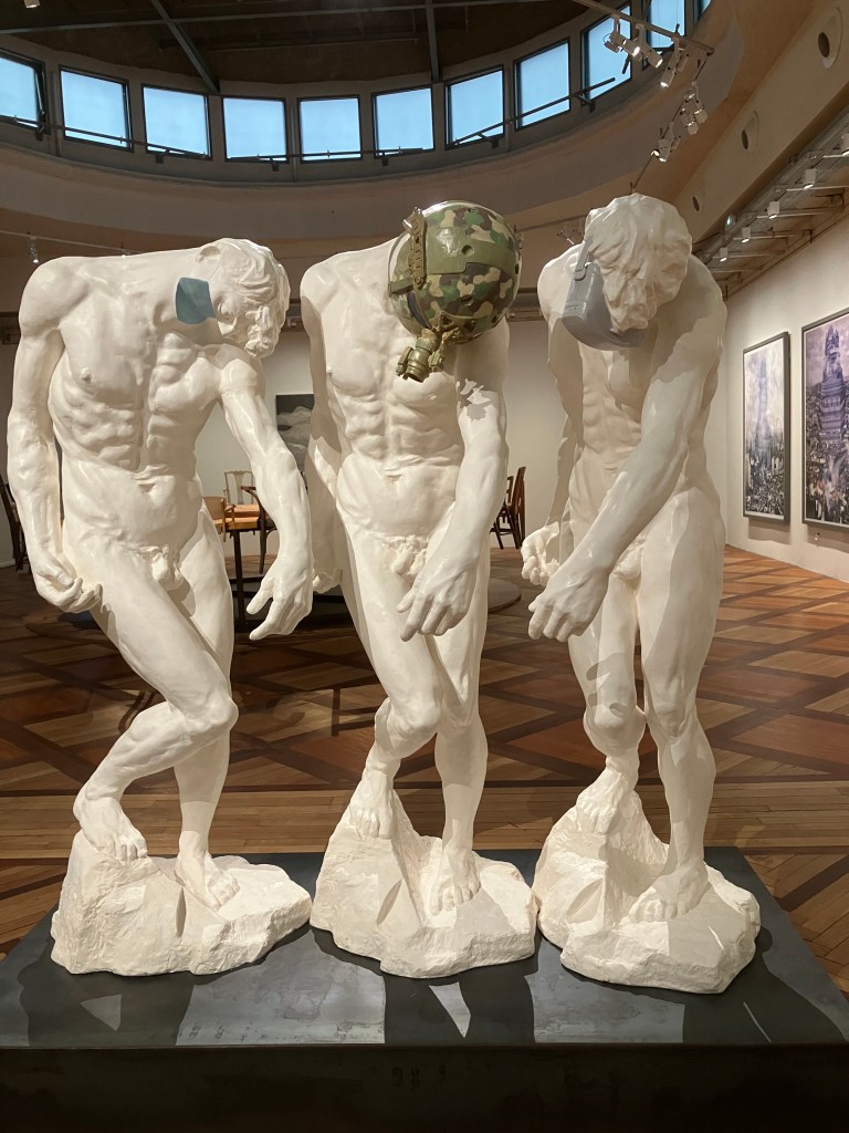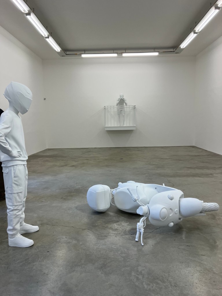 a) notre cher duo d’artistes scandinaves basés a Berlin Elmgreen &Dragset qui travaillent ensemble depuis 95. Ils ont actuellement une expo au centre Pompidou Metz . Ils présentent ici jusqu’au 18 novembre 7 sculptures ou groupes sculptés , de jeunes gens , en état d’absorption technologique.Ils sont en bronze laque de blanc . Déjà en 96 dans la performanceTRY, 3 jeunes gens mutiques, écoutaient leur walkman .