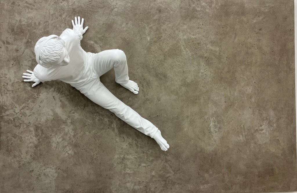 David, assis sur une reproduction du sol de la galerie a son casque sur les oreilles dans ce tableau-sculpture , vertical sur le mur .