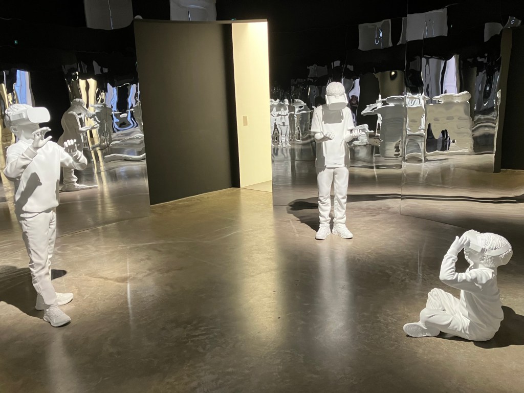puis dans une structure circulaire, tapissee de miroirs 3 enfants absents au monde réel, avec leur casque de réalité virtuelle .