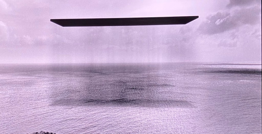 des partie exposées , puis une ombre passe, ce qui nous semblait familier disparait .On voit une ombre très geometrique , celle d’un objet volant. Militaire? L’inquiétude vient aussi de la musique.
