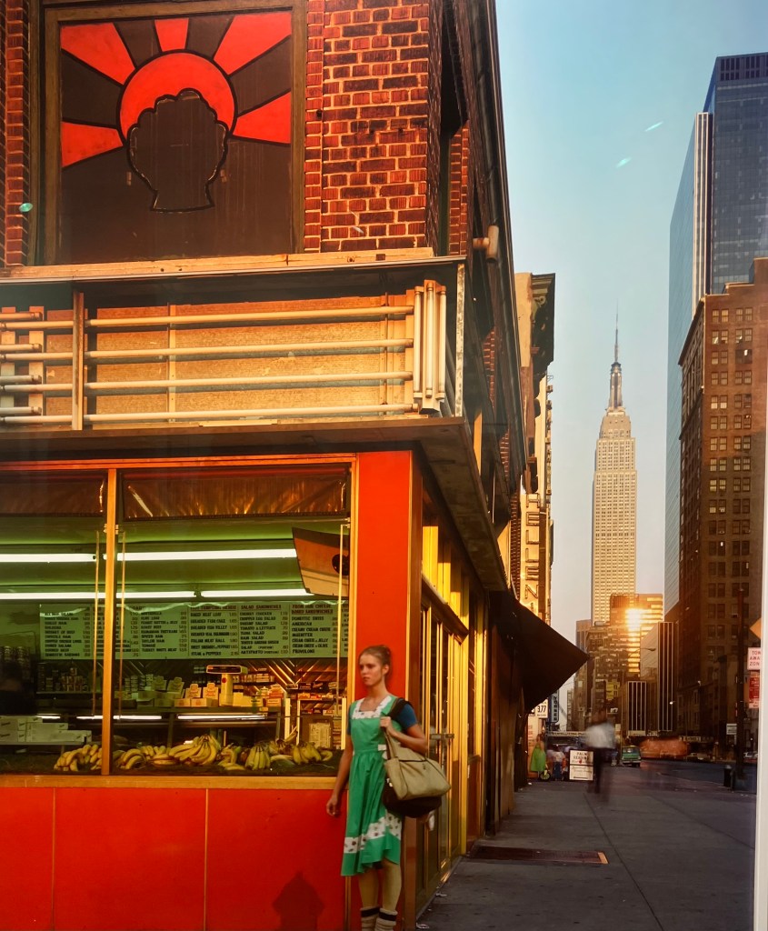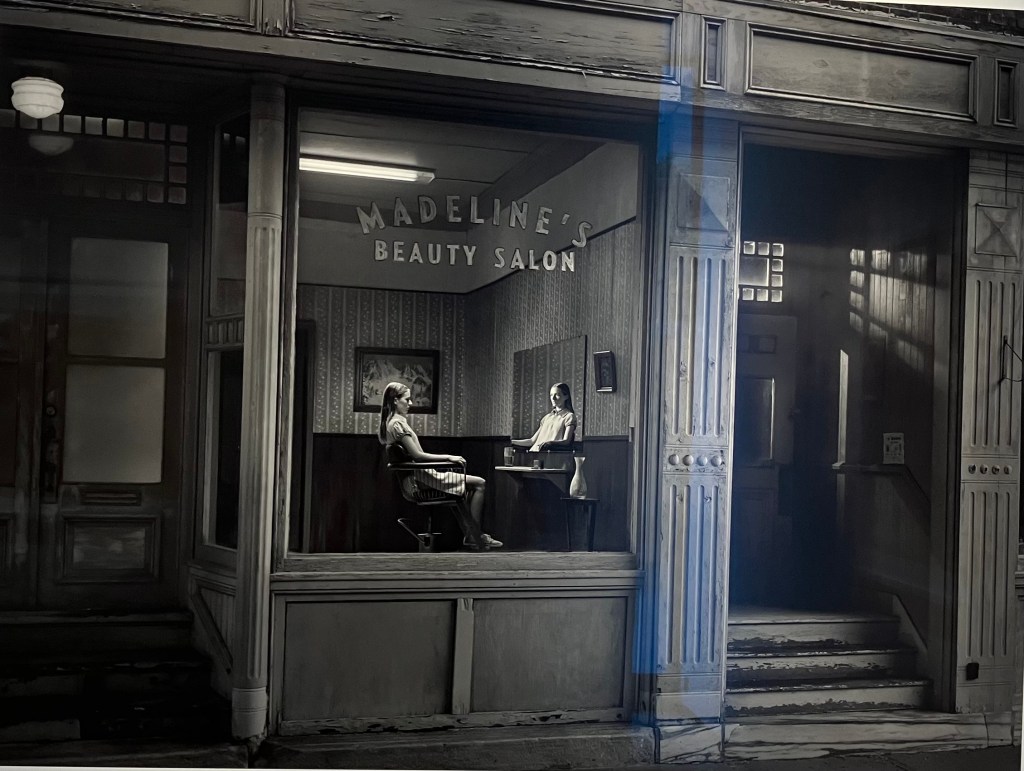Vous l’avez dejà vu à Arles cette année ? Nous aussi , mais le choc reste aussi fort, devant ces 20 scènes imaginaires , comme les photogrammes d’un film dont on aurait à deviner les composantes . Tout est mis en scène : lieux, netteté , personnages solitaires , souvent devant les miroirs, agencement des boutiques , rues, vêtements , positions, des voitures ( souvent des taxis ) , lumière , nuances monochromatiques , résultat d’un très long travail en amont avec storyboard, acteurs , construction des décors , effets spéciaux , brouillard .