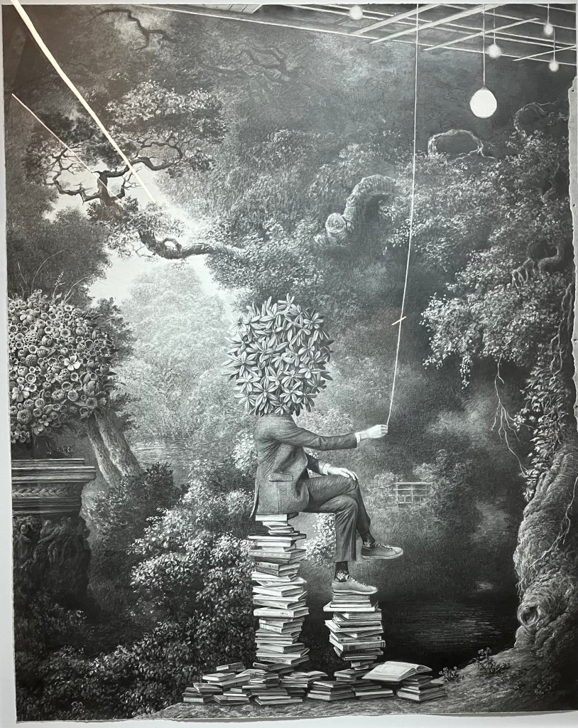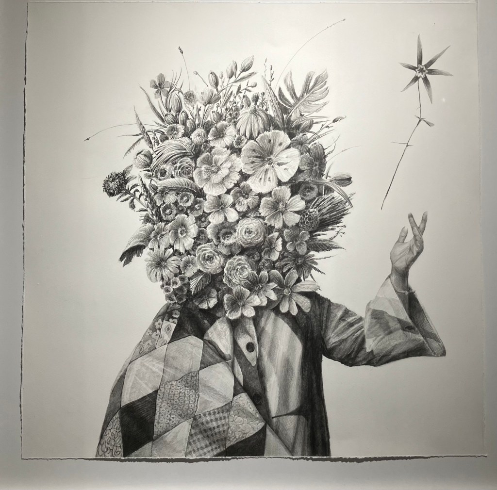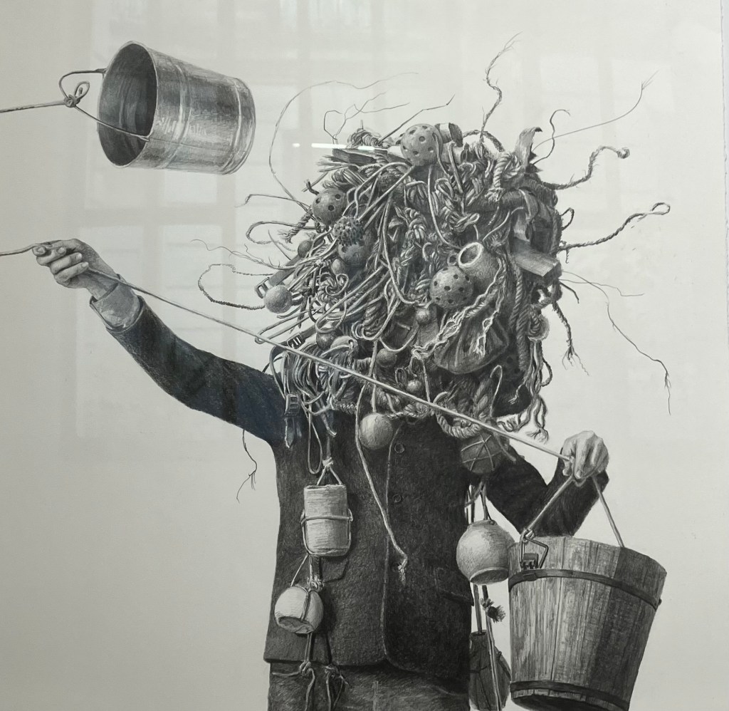 Ici on entre dans le monde des agriculteurs et des jardiniers , cela évoque Arcimboldo , le surréalisme, gravures et photos anciennes représentant les petits métiers , mais …ceux-ci sont vraiment fondamentaux à notre époque de pollution , et de basculement climatique pour essayer de préserver un équilibre .La terre est magique , dit le titre de l’exposition , et nombreuses sont les allusions à des allégories ou des contes populaires .On peut l’appréhender de façon pratique, mystique, politique ou poétique .Vous savez que le concept de « nature » a beaucoup évolué ( voir Descola , etc ) et cette façon personnelle de l’artiste de la ressentir participe à notre nouvelle compréhension .