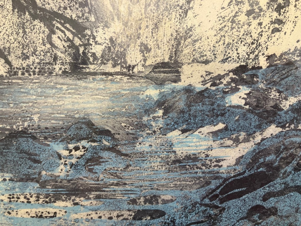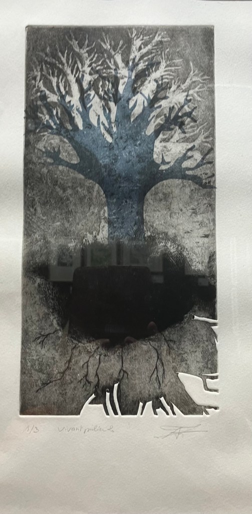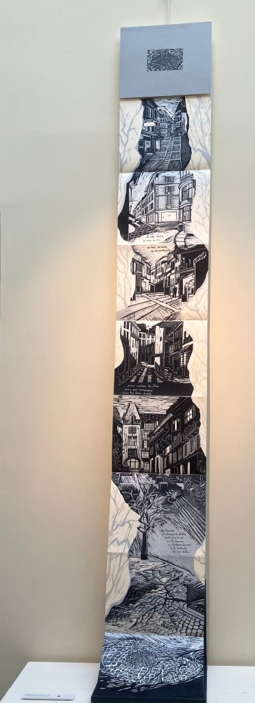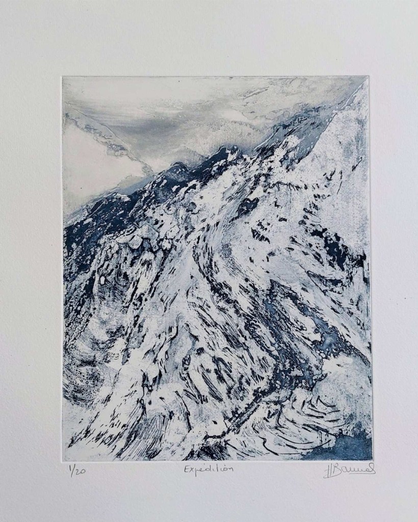 –6 – Et puisqu’on parle gravure , rendez-vous à la Fondation Taylor , rue La Bruyère .Au rez-de-chaussée et au sous -sol les oeuvres d’une seule artiste Helene Baumel, jusqu’au 3 février .La lauréate du Grand Prix LG Baudry y expose plus de soixante- dix gravures , aquatintes en noir et blanc et en divers bleus , linographies , et livres d’artiste illustrant des poèmes , sur le thème de la nature , du paysage de montagnes et d’eaux , avec une très grande maîtrise technique .