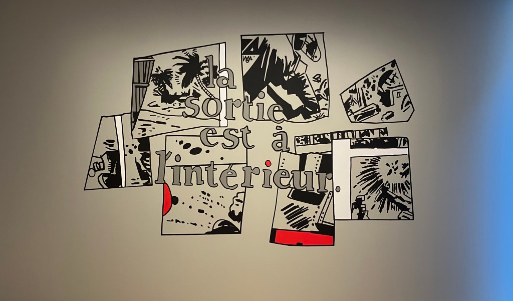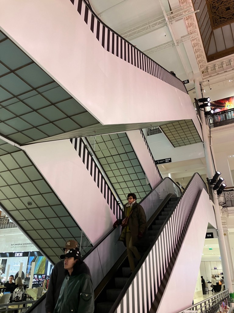 l’installation recouvre ( intérieur- extérieur) les garde- corps des célèbres escalators d’Andrée Putman de ses bandes de 8,7 cls de large en noir et blanc .