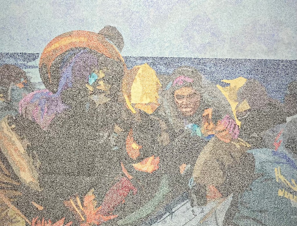 En 8 tableaux , il montre la migration clandestine en mer , il a longuement fréquenté les côtes du Sénégal , et les pêcheurs victimes de concurrence et de problèmes financiers devenus alors passeurs pour survivre et veut apporter son témoignage sur ce fait de société .