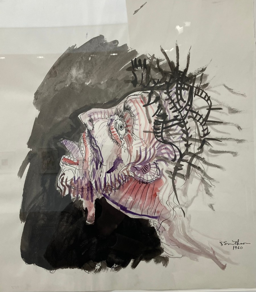 oui, certes , mais ici , dans les deux espaces ( la librairie au 66 )ne sont présentées que des oeuvres sur papier , dessins et collages , des années 60 .La vie moderne se mêle à l’histoire , à l’histoire de l’art , aux dogmes des religions , du totalitarisme ,en utilisant des images de films ,des pochettes de disques .