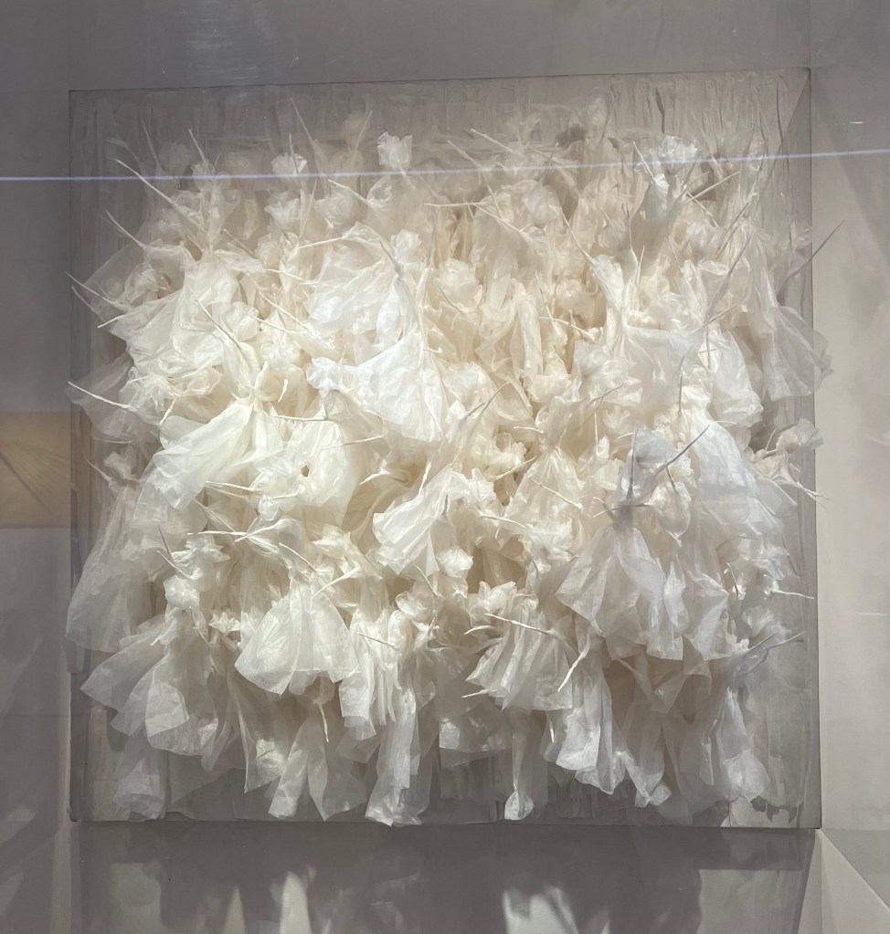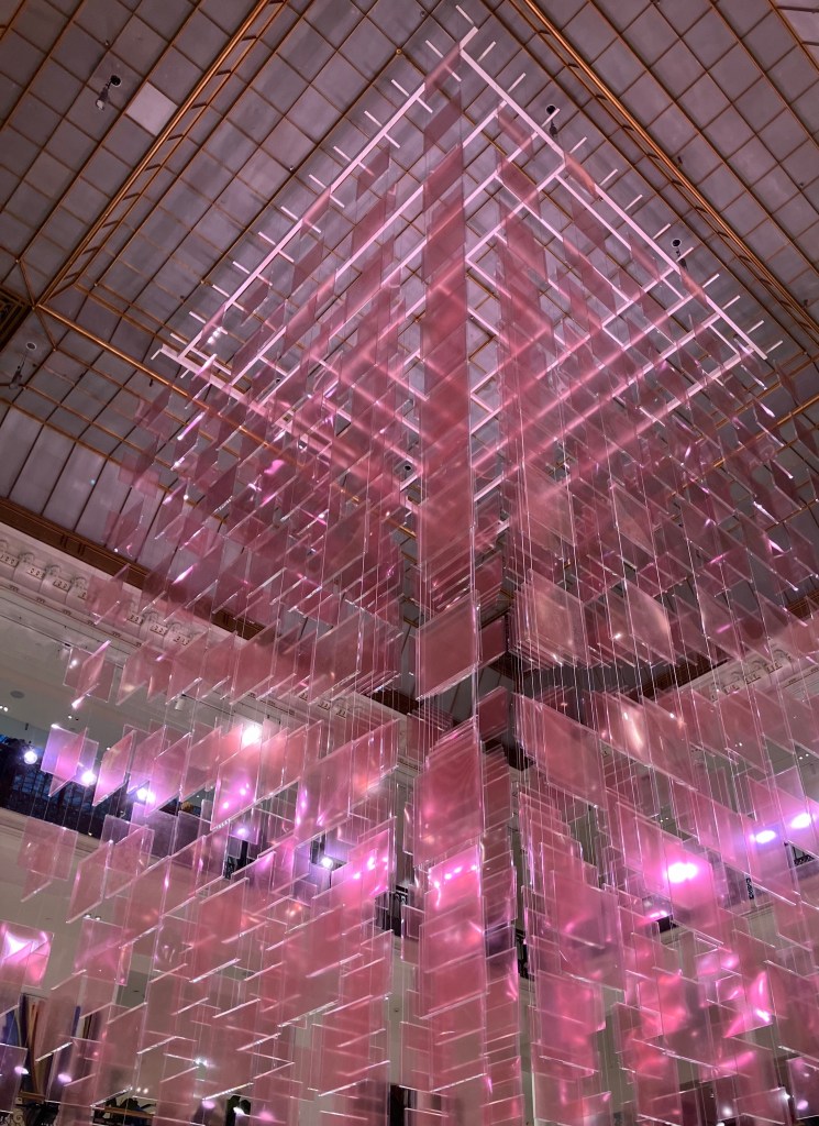 Quinconces , ce sont 756 carrés suspendus en vinyle blanc translucide , et 756 autres en vinyle rose .Chacune des pièces se déploie sur 10 mètres de haut jusqu’à 3 mètres du sol .