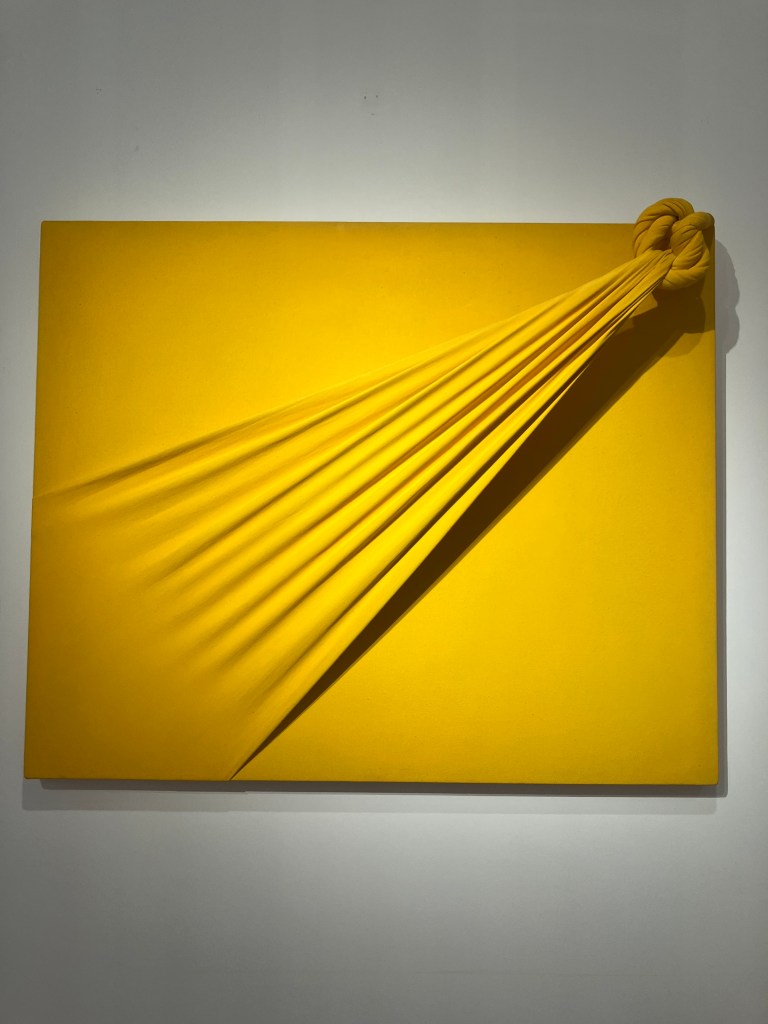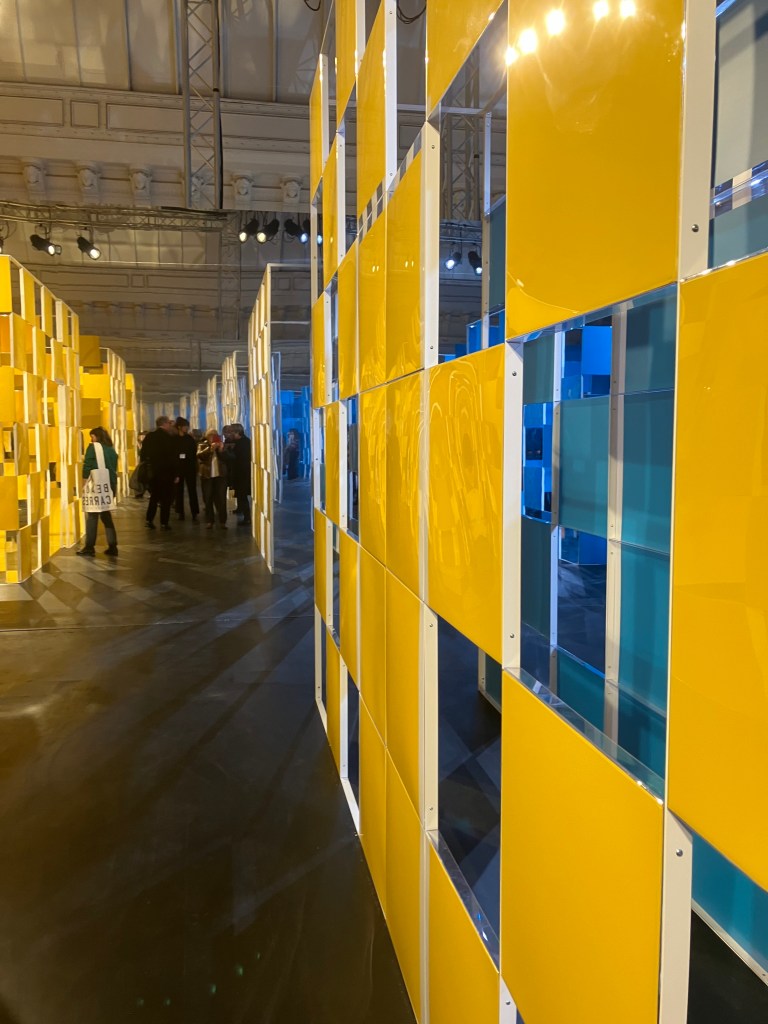 2 oeuvres immersives au deuxième étage ,2 cabanes éclatées , l’une jaune , l’autre bleue .