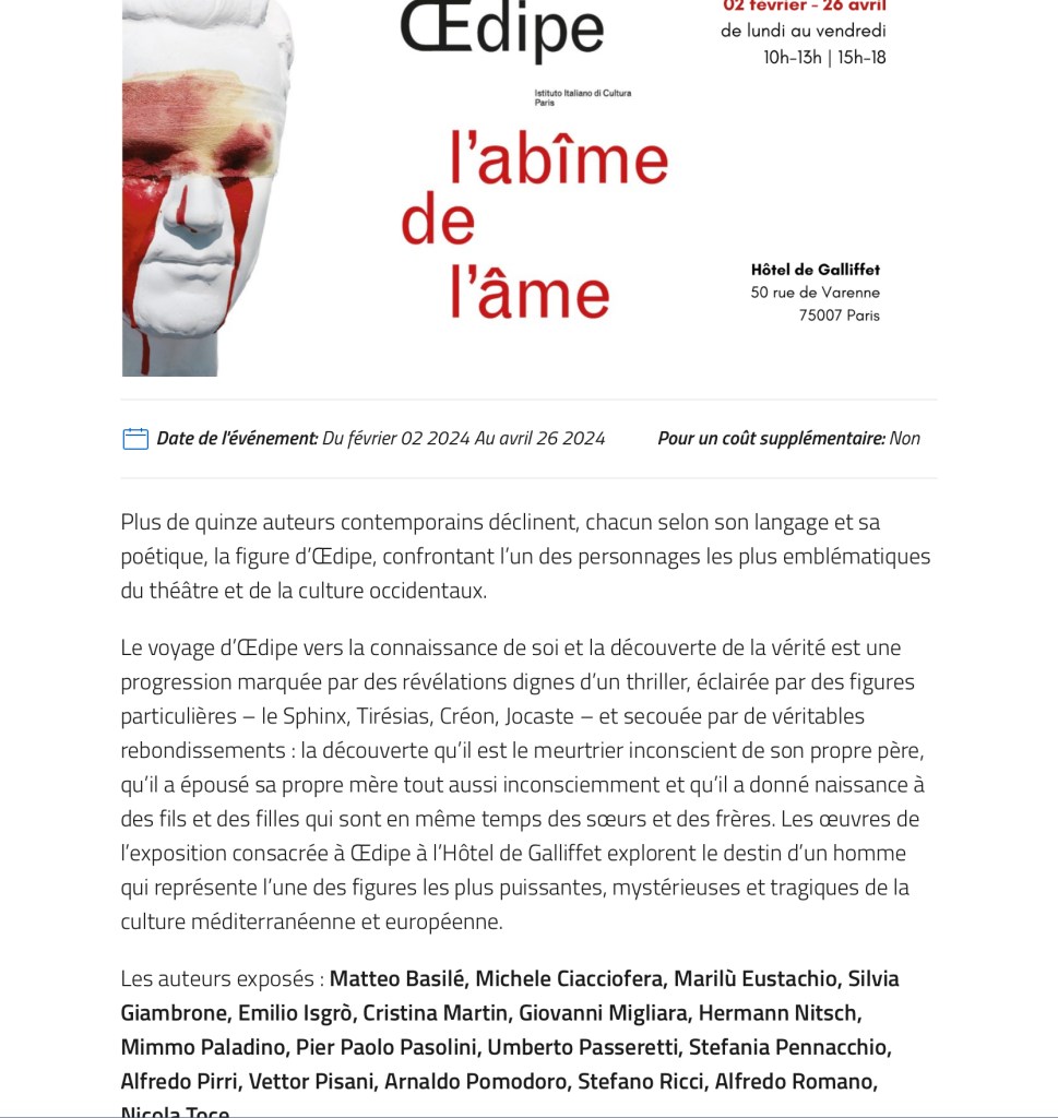 1-L’ Institut culturel italien , rue de Varenne . Si vous ne connaissez pas l’hôtel de Gallifet , ce sera un plaisir pour vous de le découvrir , ainsi que ses nombreuses propositions gratuites : conférences , pièces , concerts , films , tables rondes et bien sûr expositions .