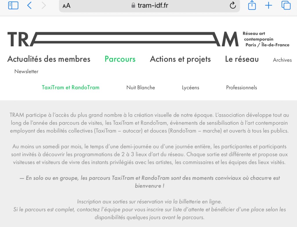 taxi tram fédère 34 centres d’art du Grand Paris et de Paris . On paye 10 euros , on est transporté en autocar ,et commissaires , directeurs et artistes nous reçoivent , souvent avec un café et nous commentent les oeuvres , explicitant projets , choix , parcours , techniques , c’est passionnant et sans médiation subjective . On se sent privilégié de bénéficier de cet aspect direct , chaleureux et amical .Pour la nuit blanche, 3 parcours sont prévus .