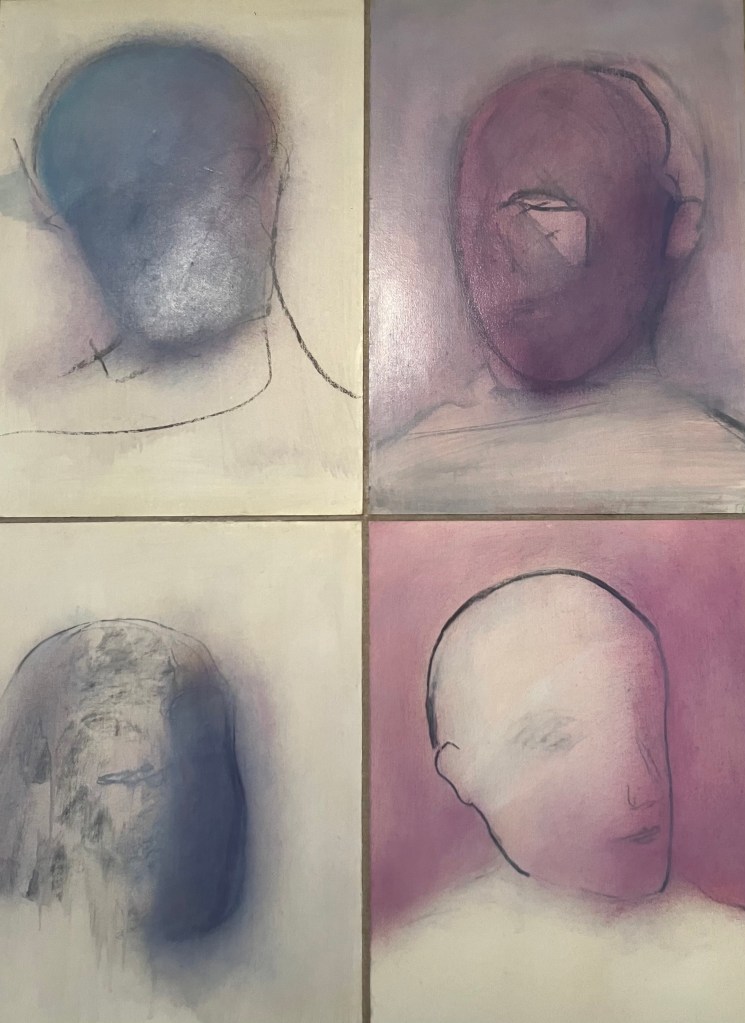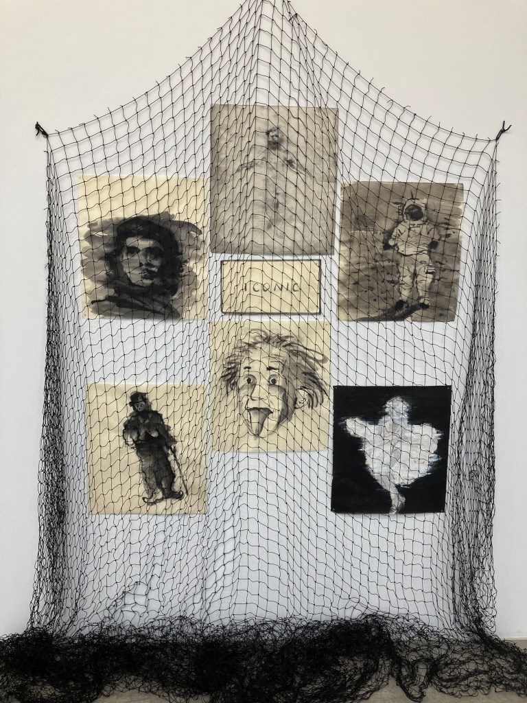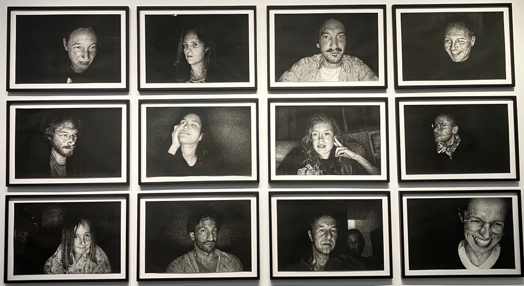 Bien différente est la série en noir et blanc , de portraits au fusain , dessinés lors de séances par zoom , pendant la pandémie , de personnes au visage retro-éclairé par leur ordinateur .