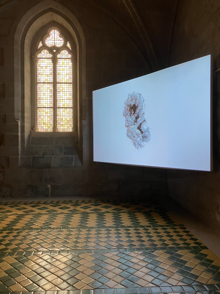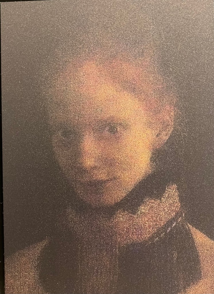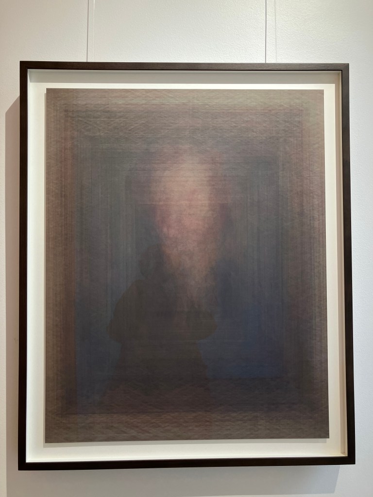 Le seul artiste avec qui j’ai longuement discuté est canadien, il présente trois oeuvres , par bonheur dispersées dans l’expo . Il s’agit de Martin Désilets , qui parcourt les musées, photographiant toutes les oeuvres , en suivant un protocole strict pour superposer les photos , d’un musée , d’une collection , ou d’une thématique. C’est conceptuel , sensible , à la limite de l’abstrait , vibrant .